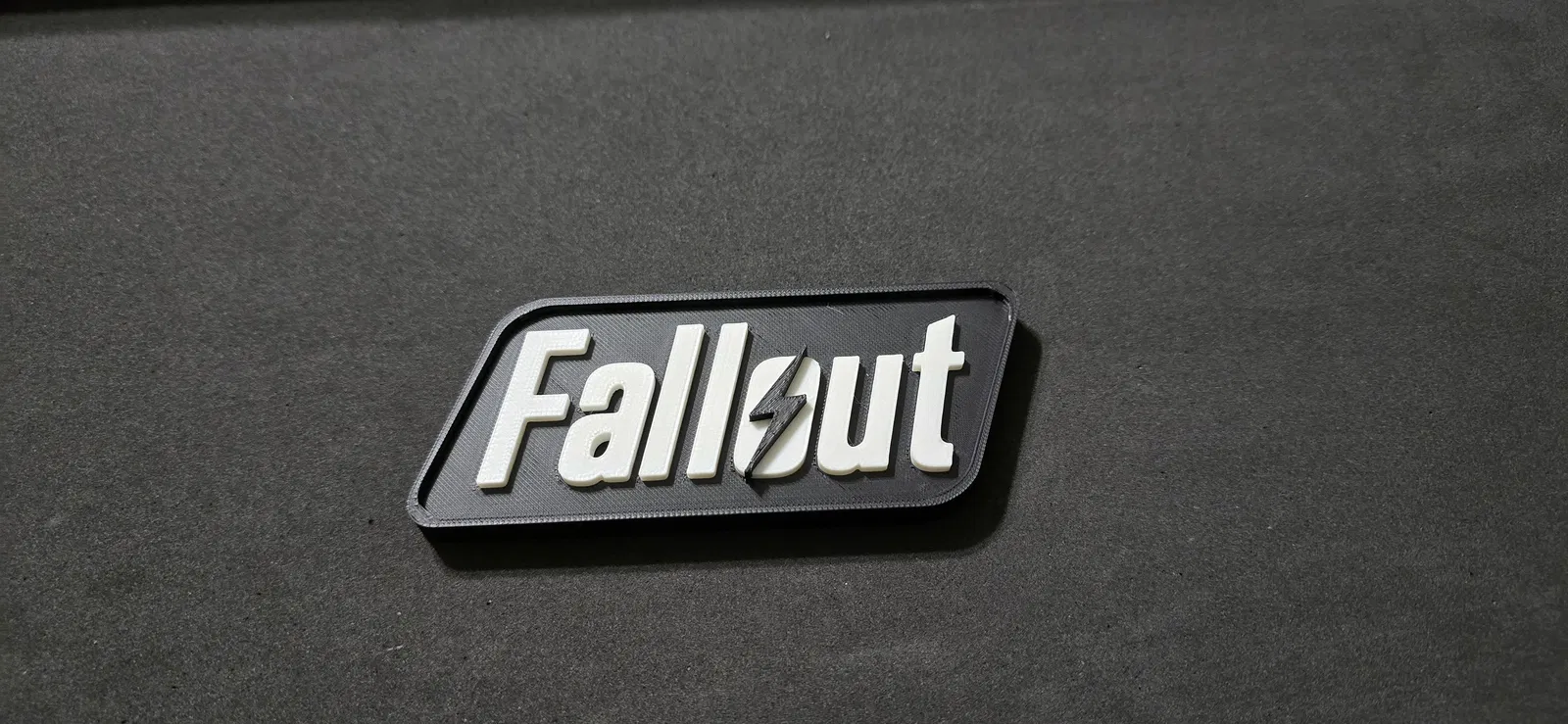 Logo phong cách Fallout 4, thiết kế NO AMS. Kích thước 120×50×8 mm. Chữ và tia sét tách rời để dễ in khác màu; các chi tiết snap-fit lắp vào nhau, không cần keo. Phù hợp in PLA/PLA Pro.