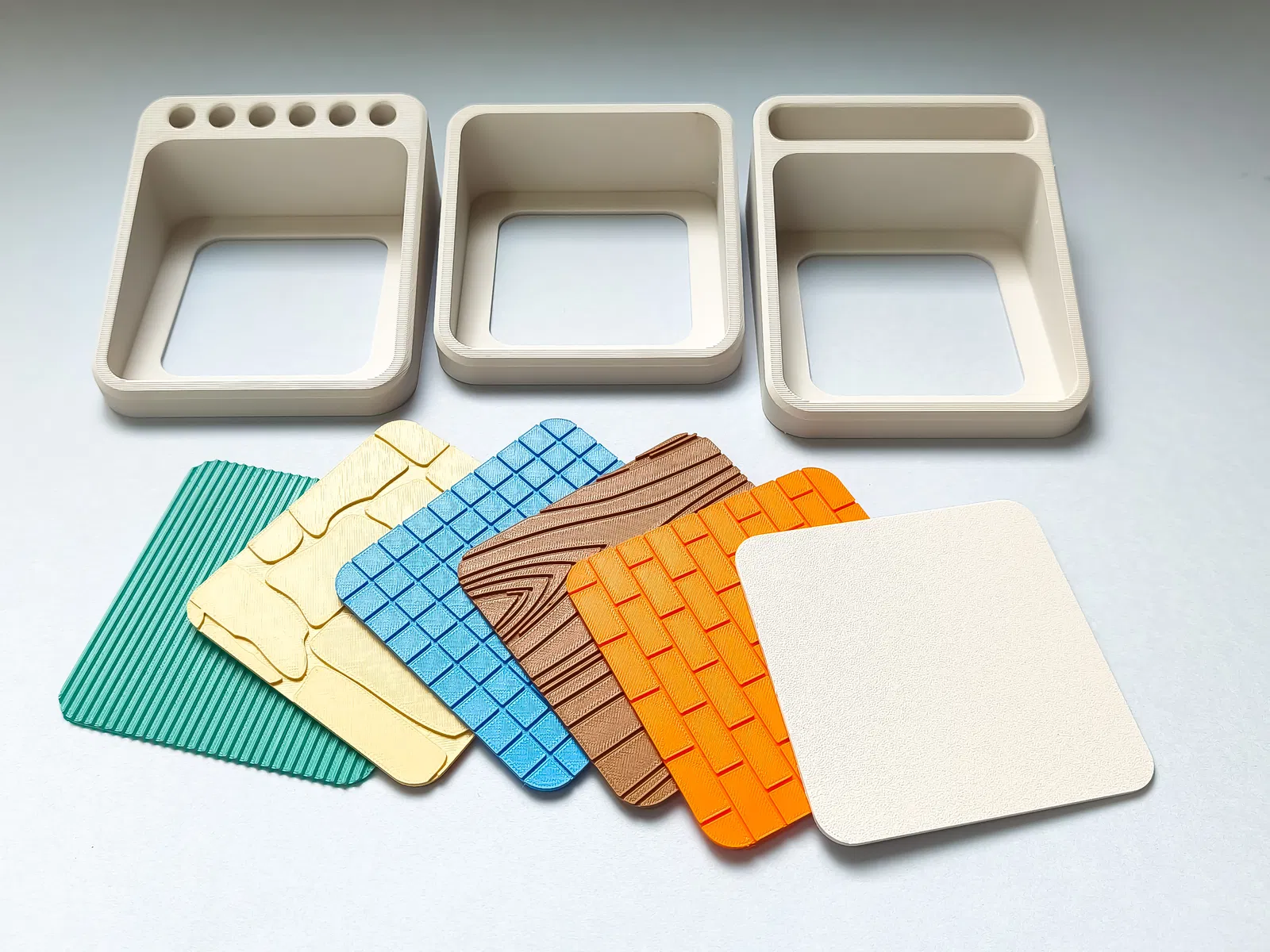 Bộ 3 khay đa năng để bàn gồm khay đựng đồ lặt vặt, giá cắm bút/dụng cụ và đế dựng điện thoại. Phần đáy bên trong tùy biến với nắp trang trí hoặc tự thiết kế, có thể kết hợp vật liệu như gỗ, resin, gốm, vinyl.