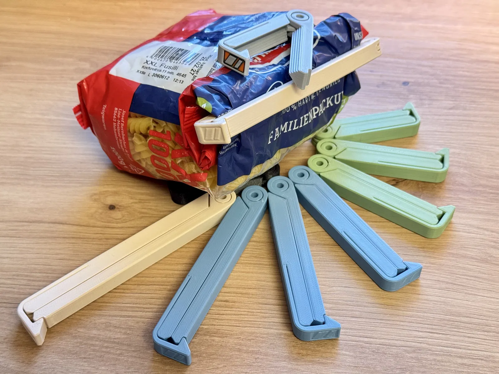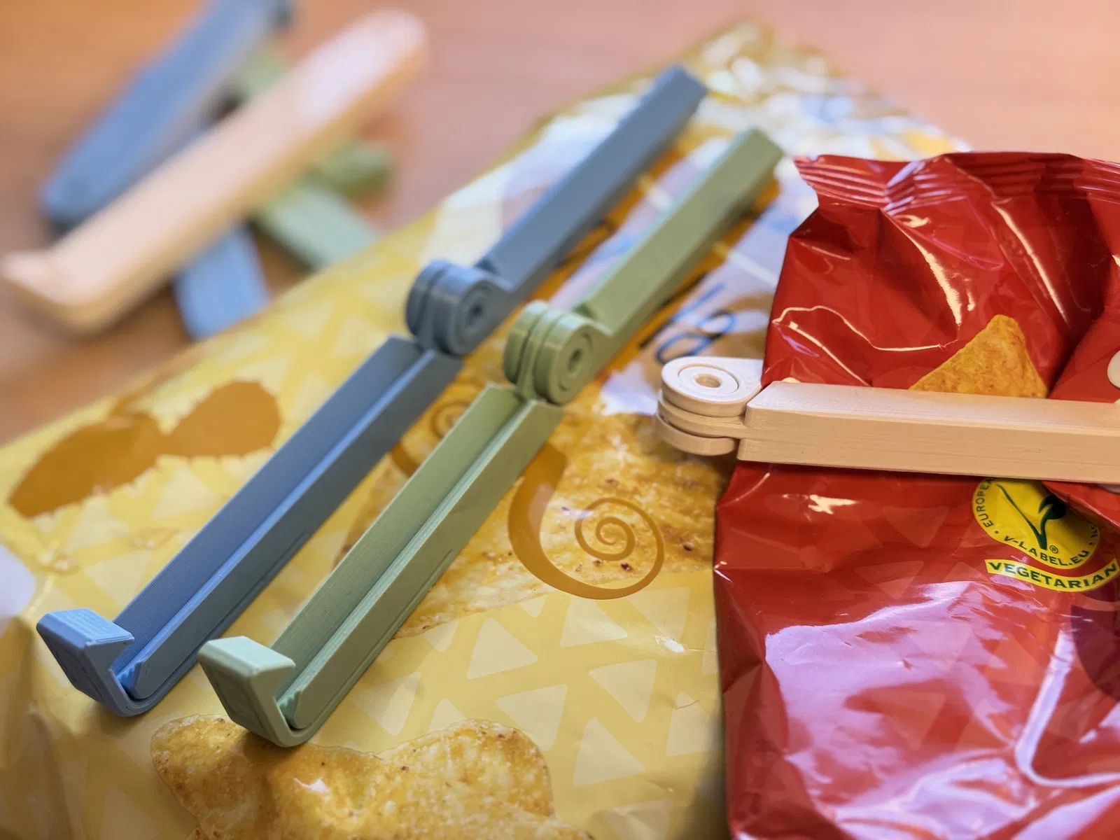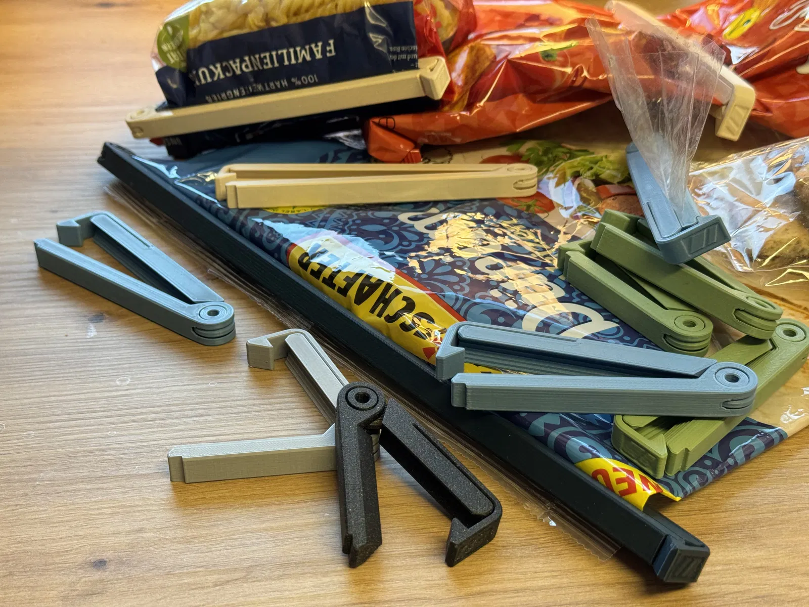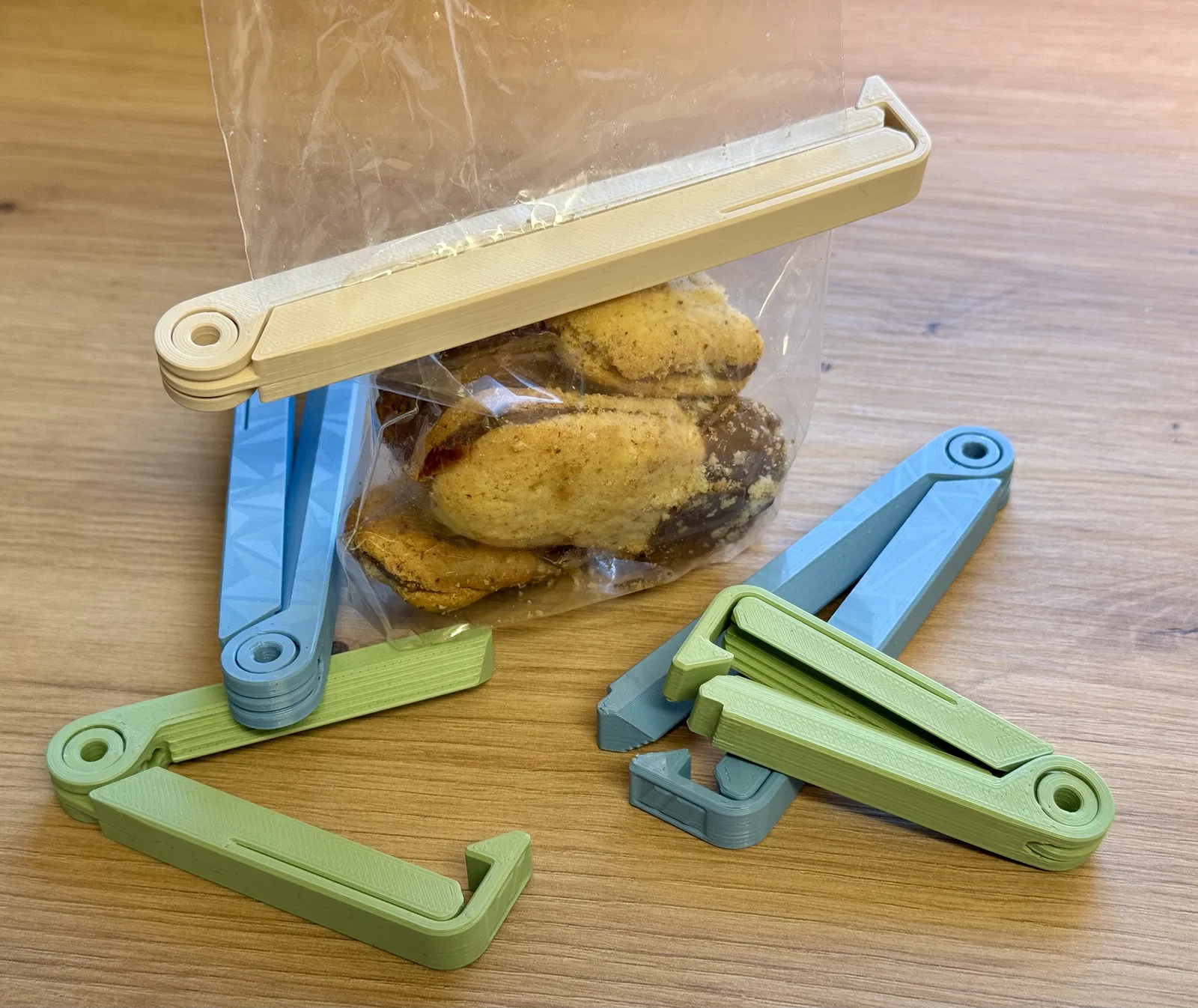 Kẹp miệng túi dạng print in place, kẹp chặt cả túi mỏng, dùng được một tay và rất bền. In đúng orientation, không cần support. Có cầu nối chống cong vênh và lỗ hinge để treo dây.