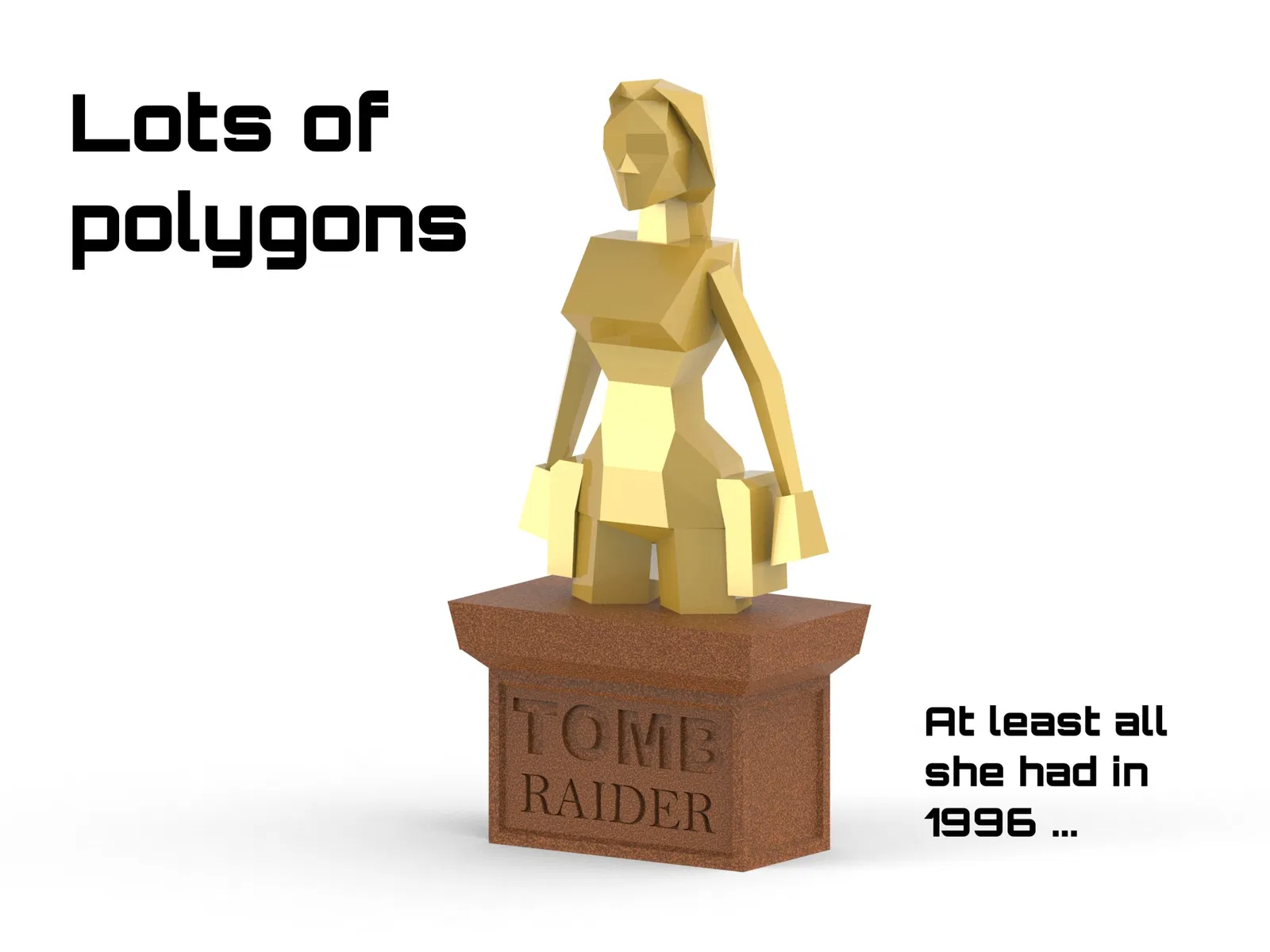 Chào mừng bạn đến với năm 1996, thời điểm mà “Low Poly” là điều tốt nhất mà một chiếc PC mới (sử dụng MS-DOS hoặc sau này là Windows 95) có thể xuất ra trên những màn hình CRT cồng kềnh. “Máy in 3D” đã có mặt - nhưng hầu hết mọi người rất có thể đã phải cướp một ngân hàng để có thể mua được một cái. ### Nó là gì Một bức tượng bán thân của Lara Croft, từ trò chơi Tomb Raider đầu tiên. ### Cách in Không có chi tiết tinh xảo nào, chỉ có một số phần nhô ra. Tôi đoán bạn sẽ tự tìm ra. ### Thông tin thú vị Tỷ lệ hình vuông của cô ấy: 92-43-90 (khoảng, nếu cô ấy cao 170cm) Các trang phục cosplay của phiên bản low poly này thật hài hước. ### Tiếp theo là gì Có thể, hãy xem thiết kế khác của tôi ;-)