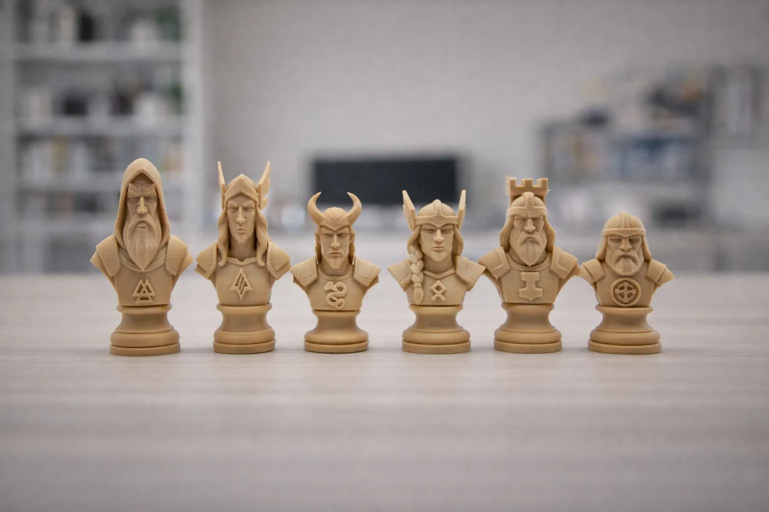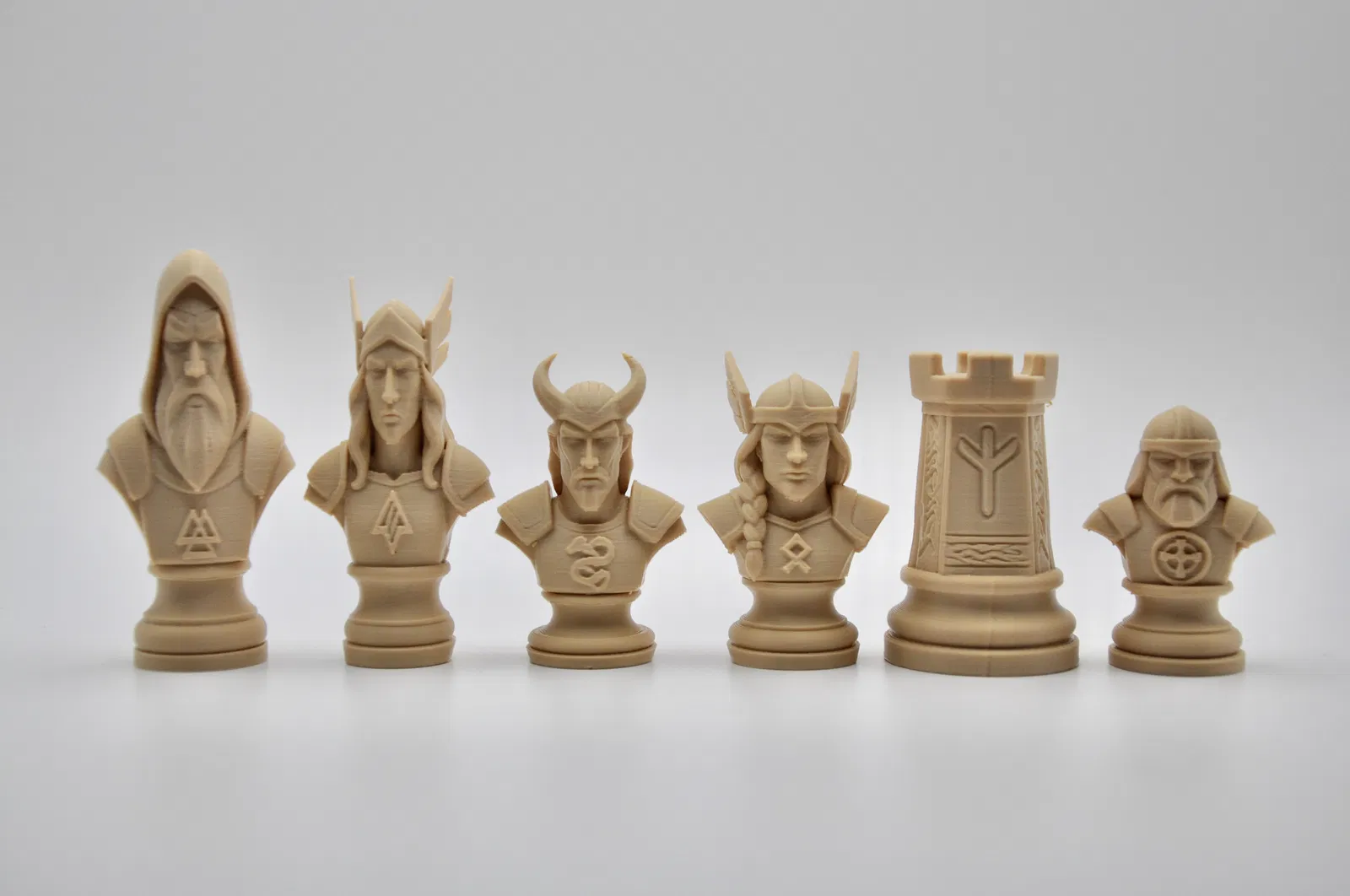 Bộ Norse Gods Chess Set đưa huyền thoại Asgard lên bàn cờ với các quân Odin, Freyja, Loki, Valkyrie, Thor/Nordic Tower và Viking Warrior. Chiều cao: King 80mm, Queen 75mm, còn lại 60mm, Pawn 50mm.
