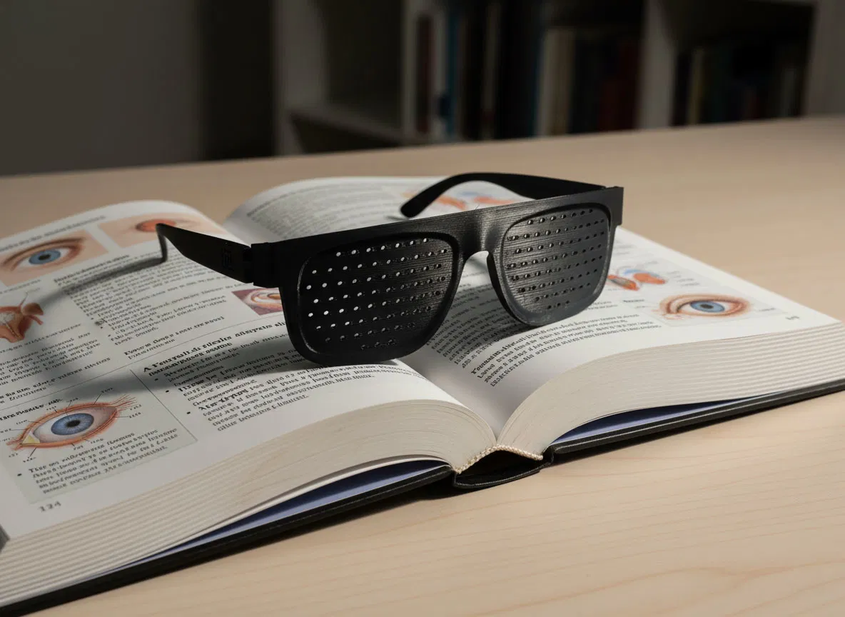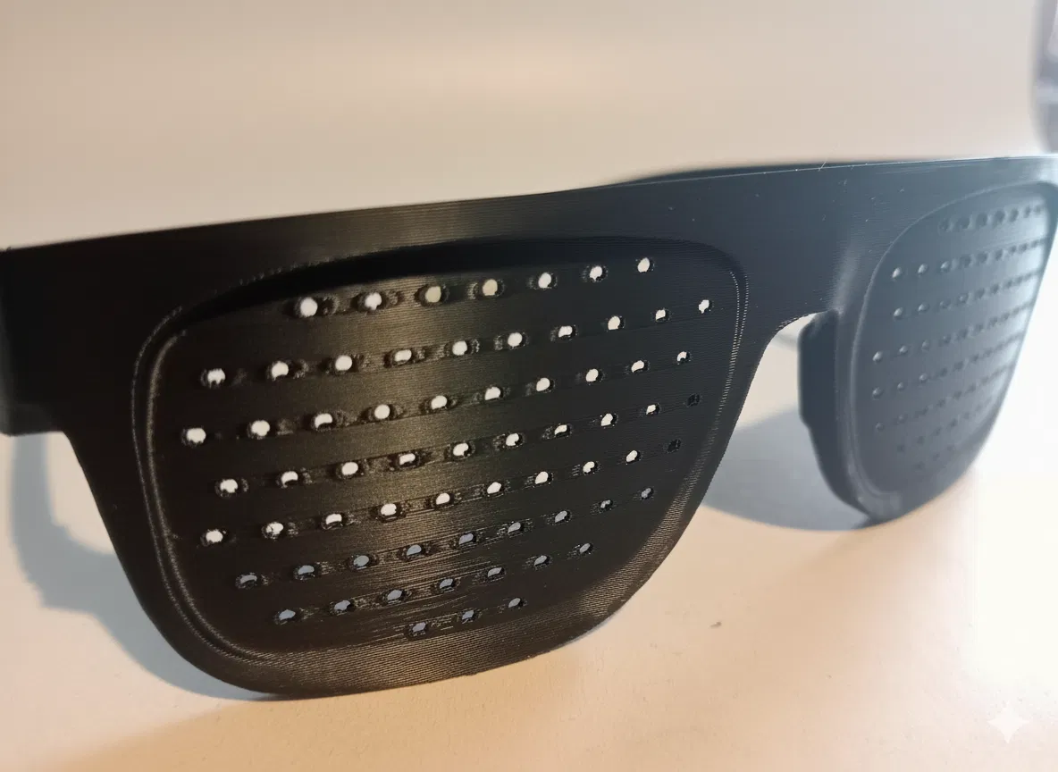 Mẫu kính pinhole Stenopeic với lỗ 1.2mm, thiết kế supportless dạng print in place. Gọng gập được, in xong dùng liền không cần hậu kỳ. Khuyến nghị bật/dùng draw seams để bề mặt đẹp hơn.