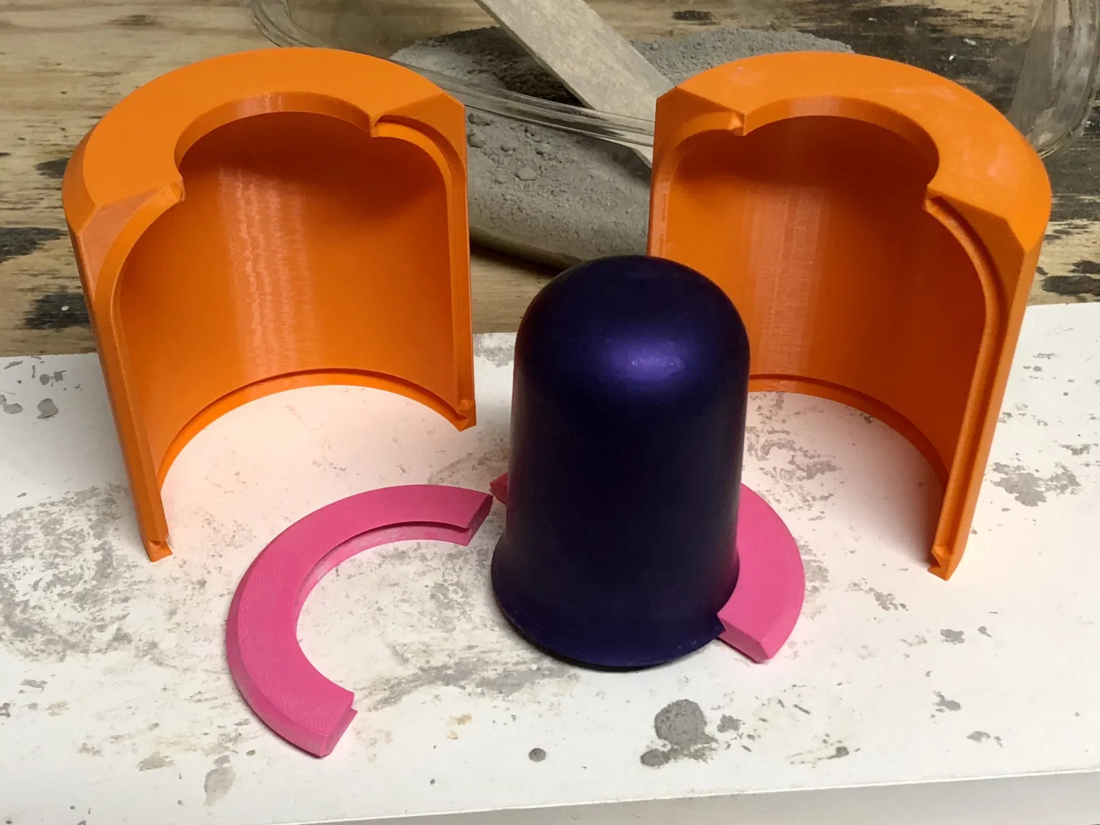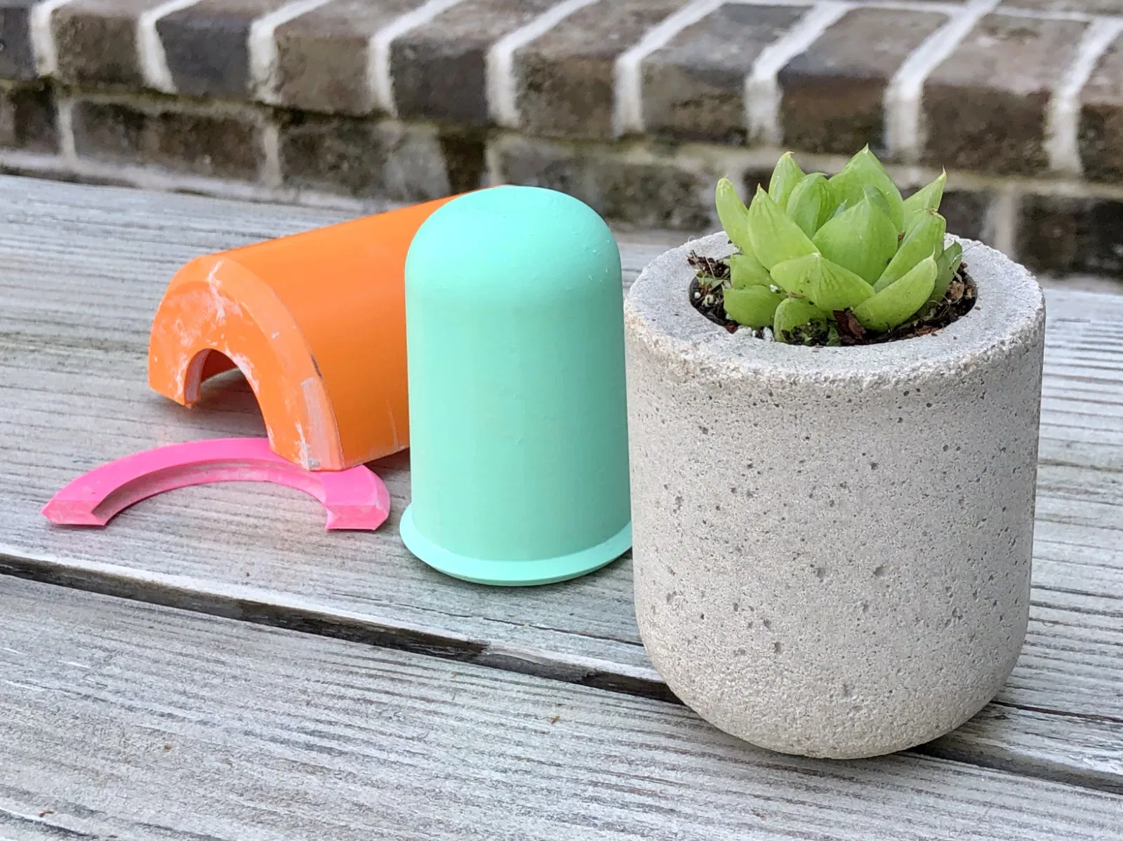 Khuôn in 3D cỡ nhỏ để đúc chậu bê tông dáng đơn giản, đáy bo tròn. In không cần supports, có thể tái sử dụng nhiều lần. Thành phẩm khoảng 75×80mm; dùng balloon và concrete patching mix để hạn chế bọt khí.