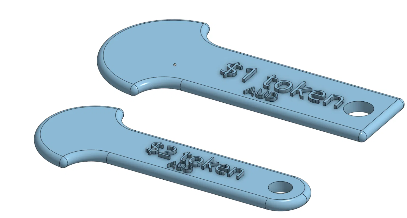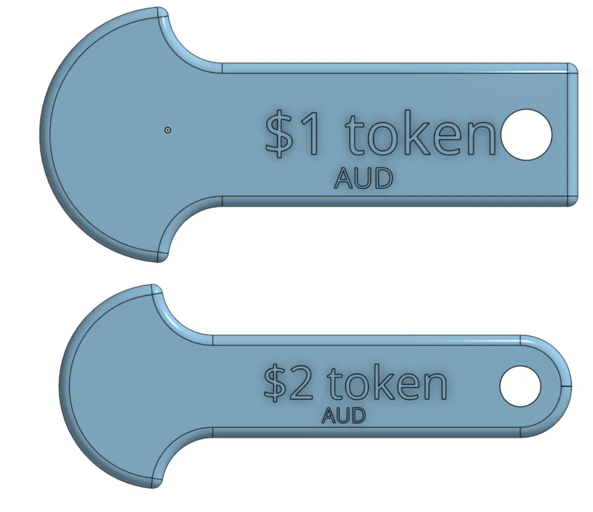Token/xu nhựa tái sử dụng thay thế xu AUD $1 và $2 để mở khóa xe đẩy mua sắm ở Úc. In PLA là ổn, có thể in multi color hoặc single color. Đã test tại Woolies; bản $1 ổn hơn, bản $2 có thể cần scale nhỏ vài %.