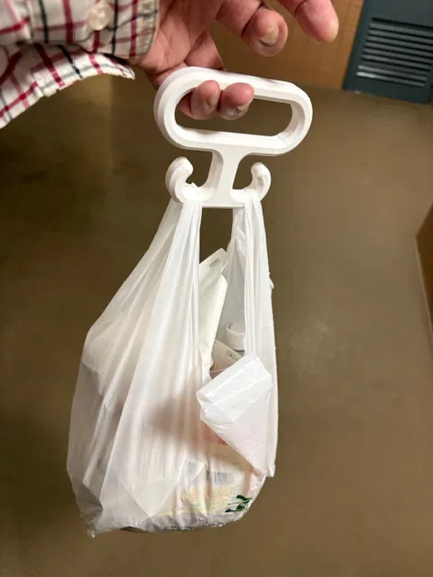 Móc xách nhỏ gọn giúp phân bổ lực đều, giảm đau và mỏi ngón tay khi xách nhiều túi nhựa hoặc túi tái sử dụng. Khuyến nghị in bằng ABS/PETG, layer 0.2mm, infill 20% và dùng support cho phần overhang.