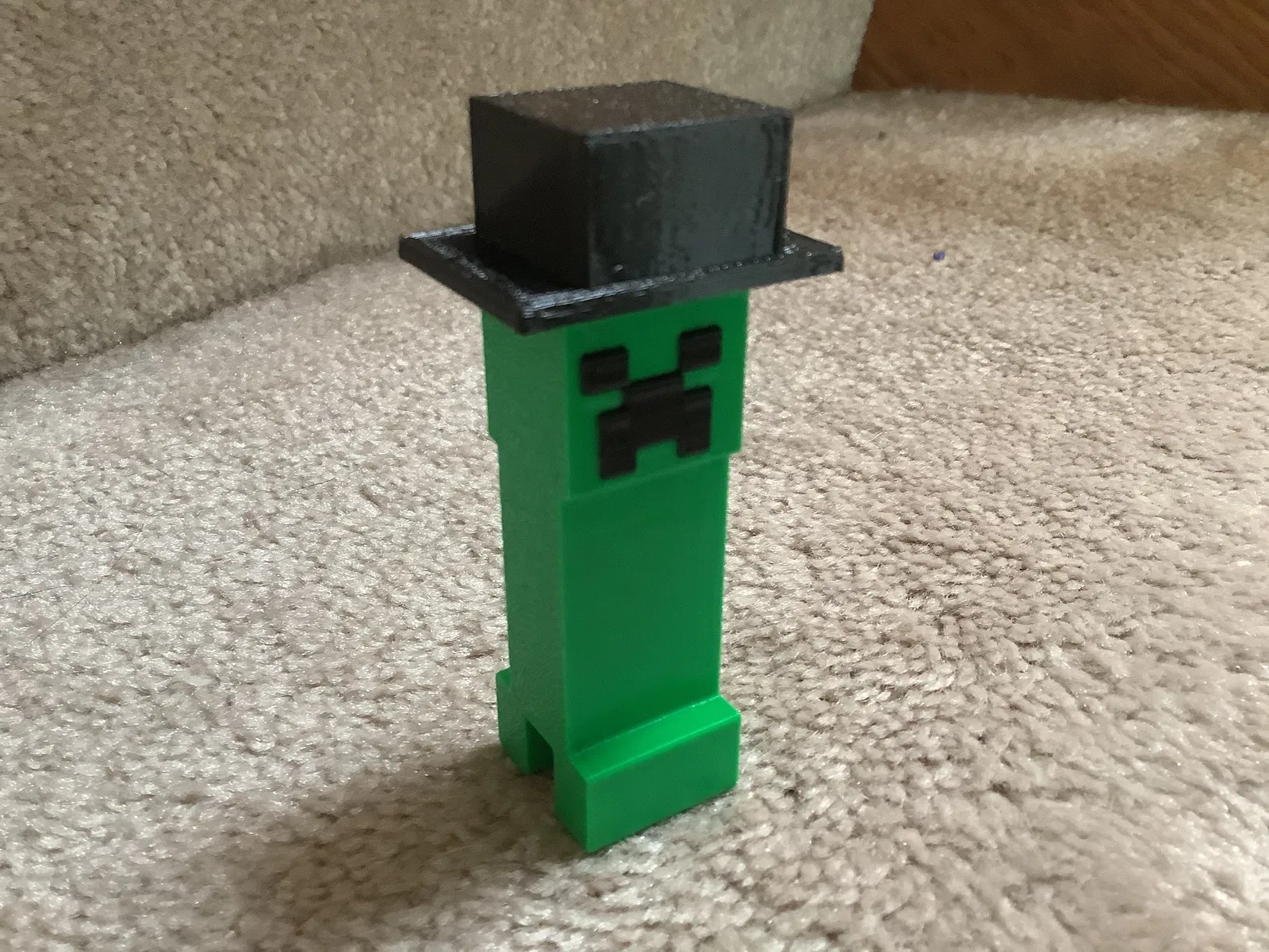 Mẫu Minecraft Creeper để bạn 3D print, đi kèm mũ top hat có thể tháo rời. Để hạn chế hoặc không cần supports, bạn có thể đặt Creeper nằm nghiêng khi in.