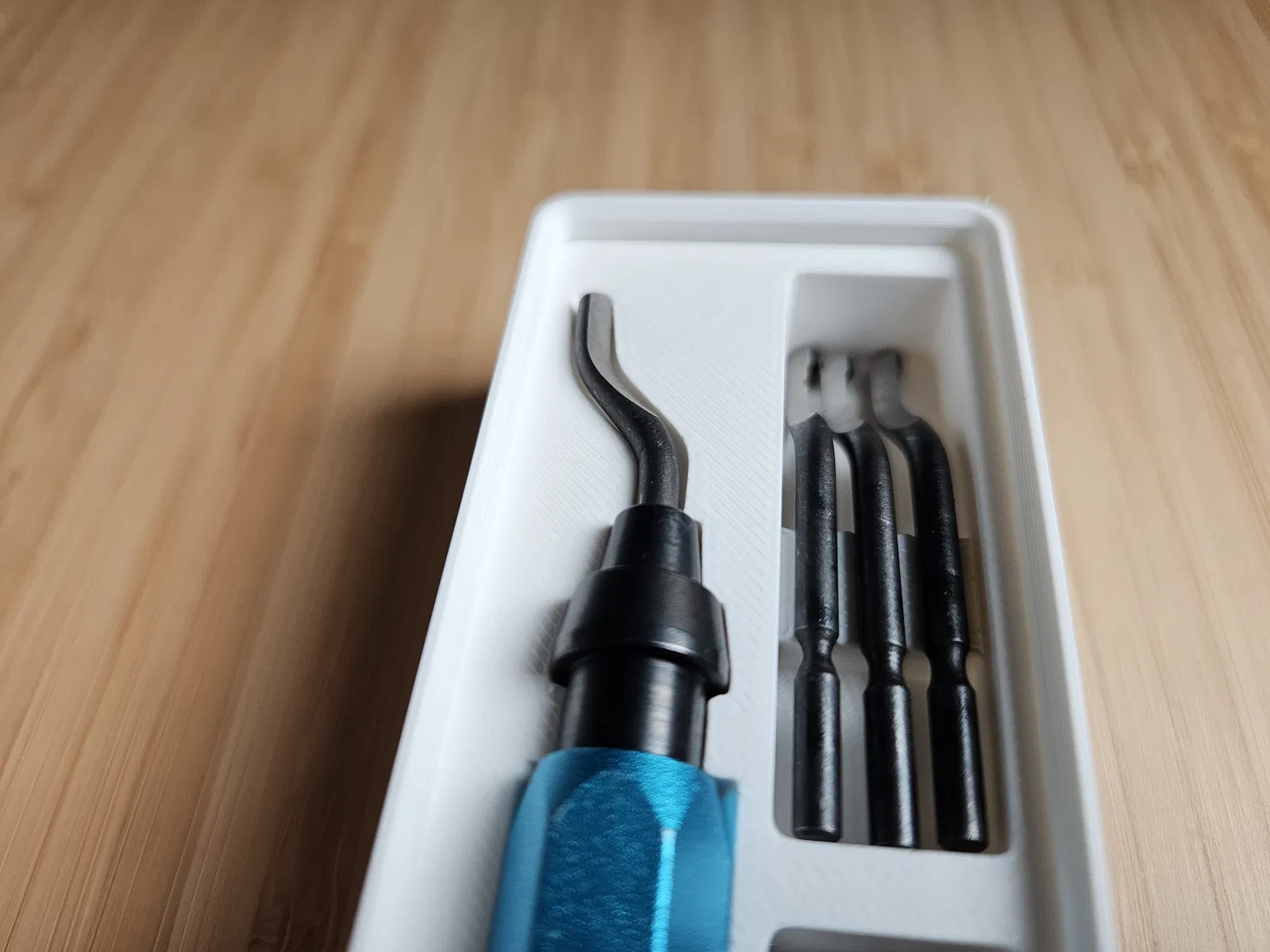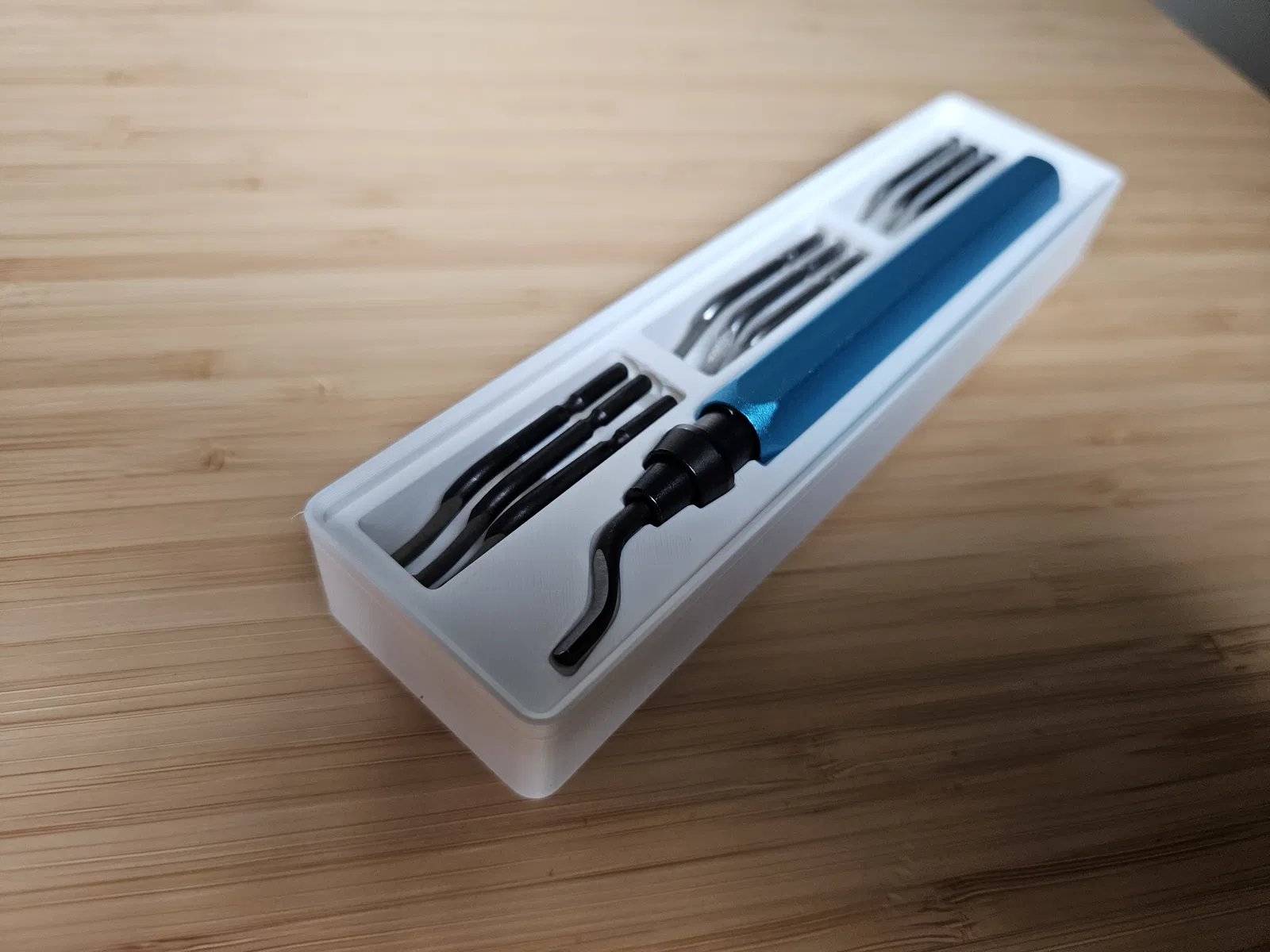 Một khay (bin) tuỳ chỉnh mình làm cho cây deburring tool lục giác bạn có thể mua trên AliExpress. Có chỗ chứa 9 lưỡi dự phòng.