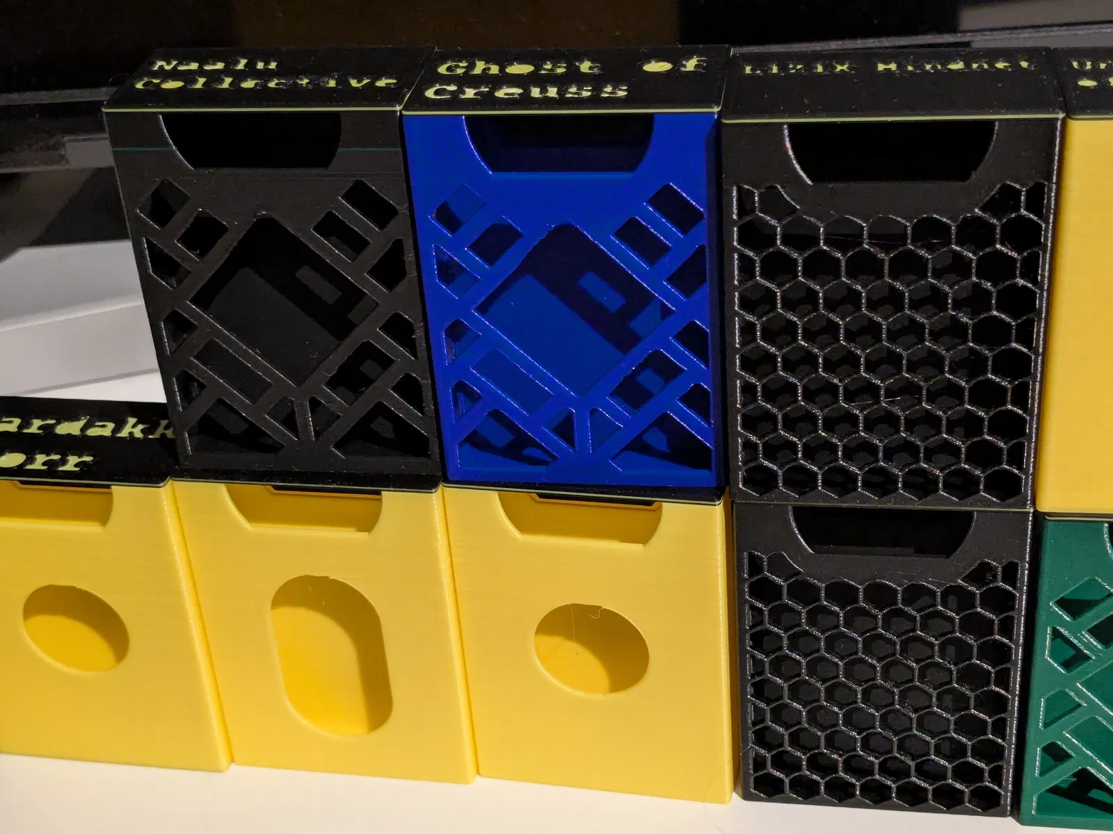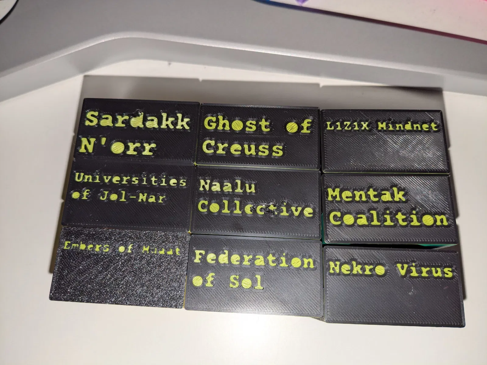 Hộp đựng faction cho Twilight Imperium 4, tối ưu cho nozzle 0.4: ít tốn filament hơn và có nắp snap-on tiện dụng, kèm tên faction. Tham khảo: 24g / ~3h với thiết lập của tác giả.