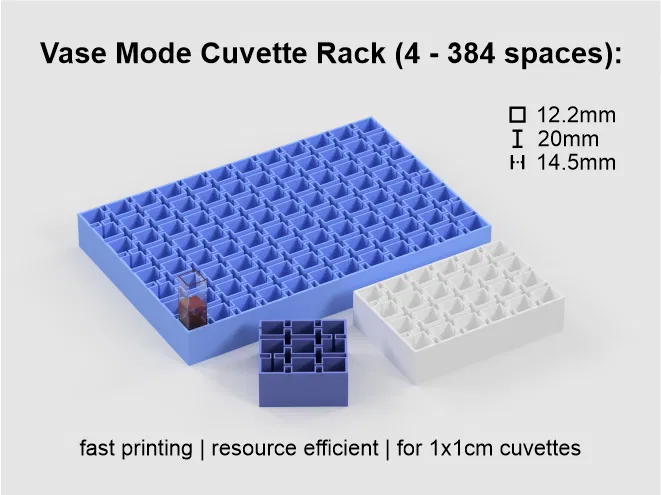 Khay/giá đỡ cuvette in vase-mode với nhiều kích thước khác nhau cho cuvette chuẩn 10 mm (ví dụ: Eppendorf, Brand, Sarstedt). Khay chắc chắn mà vẫn nhẹ, và có thể in rất nhanh ở chế độ vase mode (nhớ làm theo hướng dẫn in!).