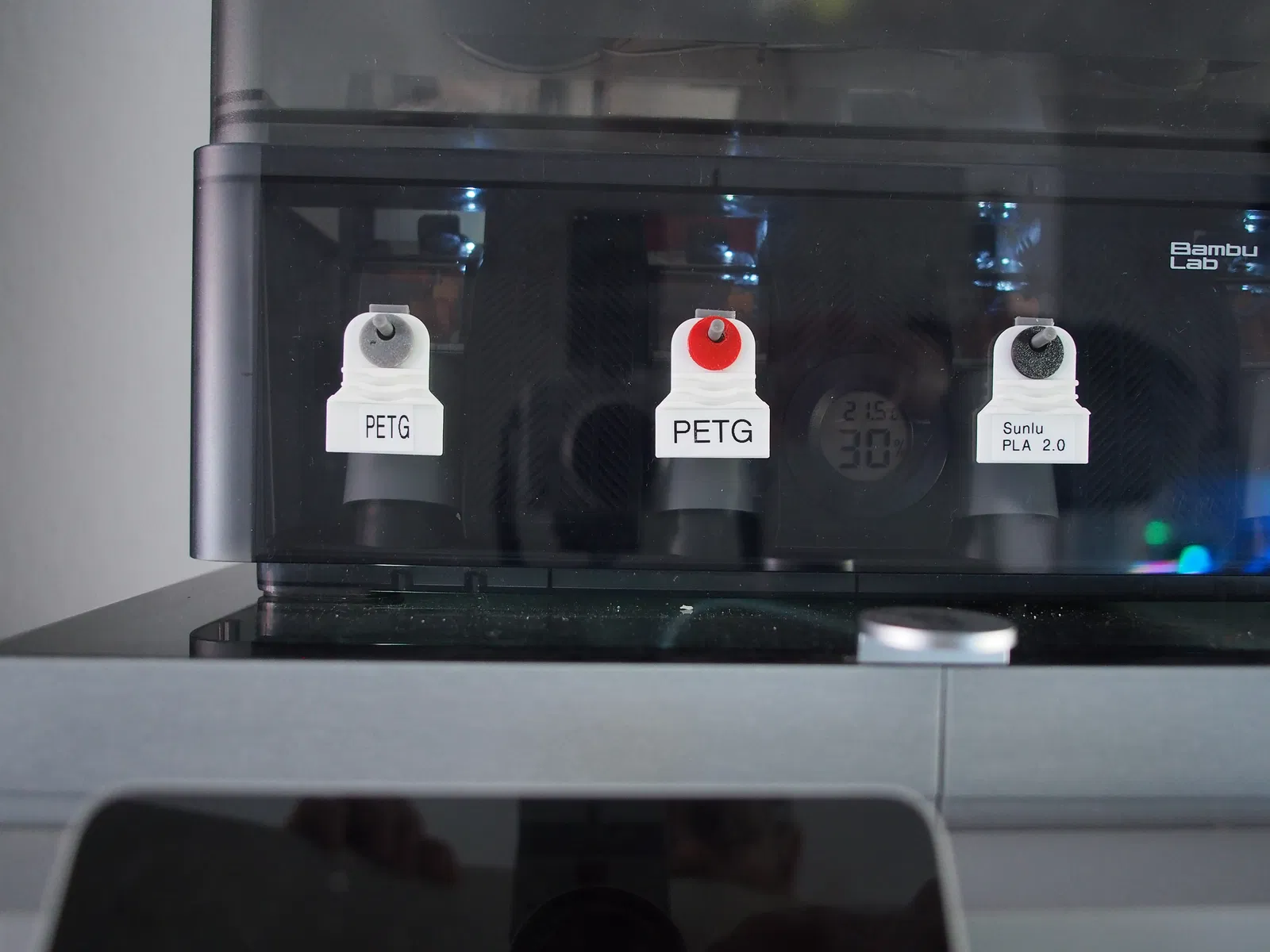 Từ trước tới giờ, mình toàn dùng mấy cái filament clip kẹp vô khung spool. Cái hay là mình dán nhãn lên đó được, nhìn cái là biết spool đang là loại filament gì. Nhưng dạo này mình có vài cái filament dryer, điểm dở là mấy cái clip đó hay vướng khi cần xoay spool. Thêm nữa là mình in chúng bằng PLA, mà PLA thì không chịu nổi nhiệt độ trong dryer.