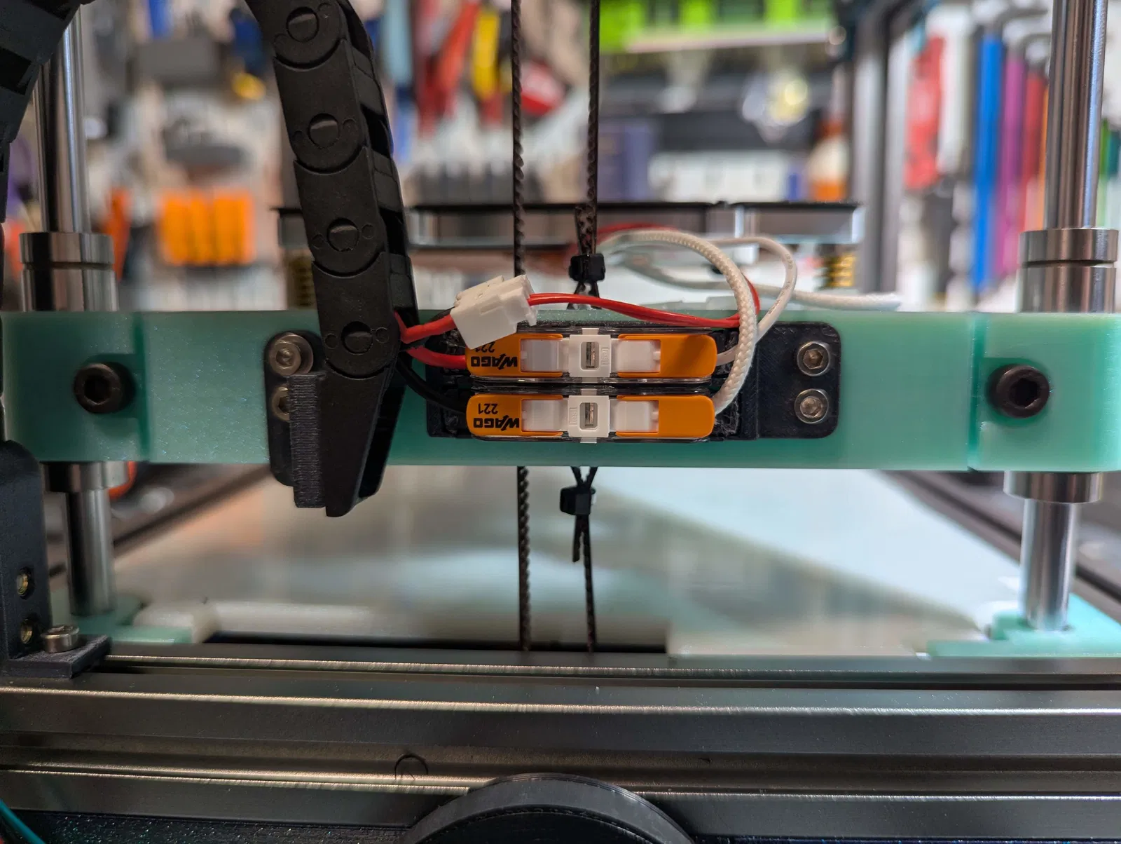 Nếu bạn chọn dùng ngàm Wago, chỉ cần gắn các wago connectors vào rồi bắt lên bed bằng 2 ốc M3X6.