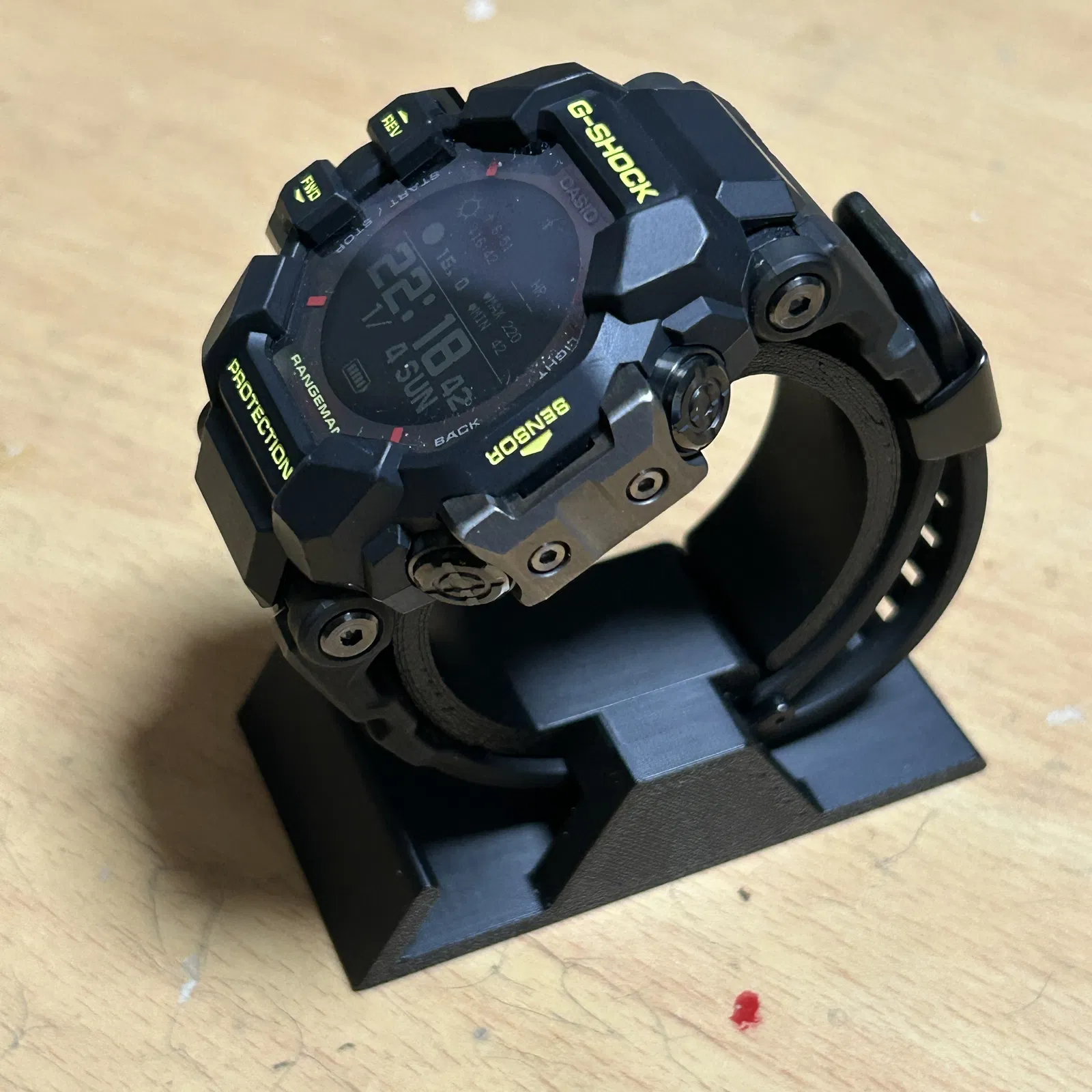 Chân đế đỡ chắc cho đồng hồ Casio G-SHOCK cỡ lớn, gồm 2 phiên bản: góc cố định và loại chỉnh góc. Bản chỉnh góc đổi theo nấc ~10°, tổng phạm vi khoảng 80°, dùng chung hộp trưng bày Daiso.