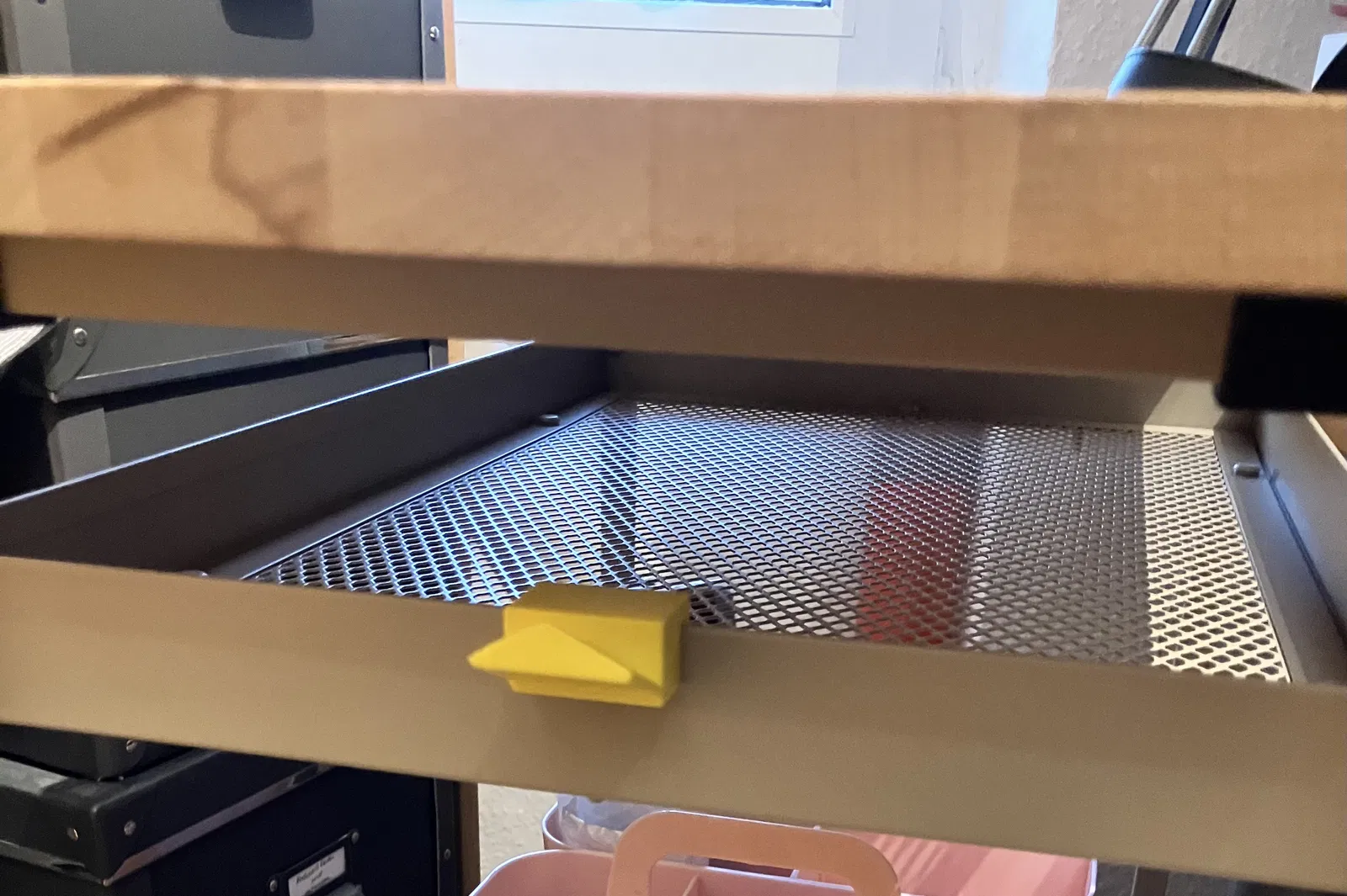 Một cái móc treo nhỏ cho thảm Cricut để gắn lên cạnh mỏng của xe đẩy IKEA Nissafors. Thảm sẽ nằm phẳng trên khung.