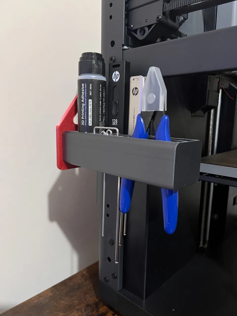 Organizer tool kit gắn hông cho Flashforge AD5X/AD5M (Adventurer 5M) dạng 2 phần: bracket bắt 2 vít phía sau và khay organizer ép khít. Đựng glue stick, Allen keys, kềm cắt, tool thông nozzle, 2 USB và 1 ô trống.