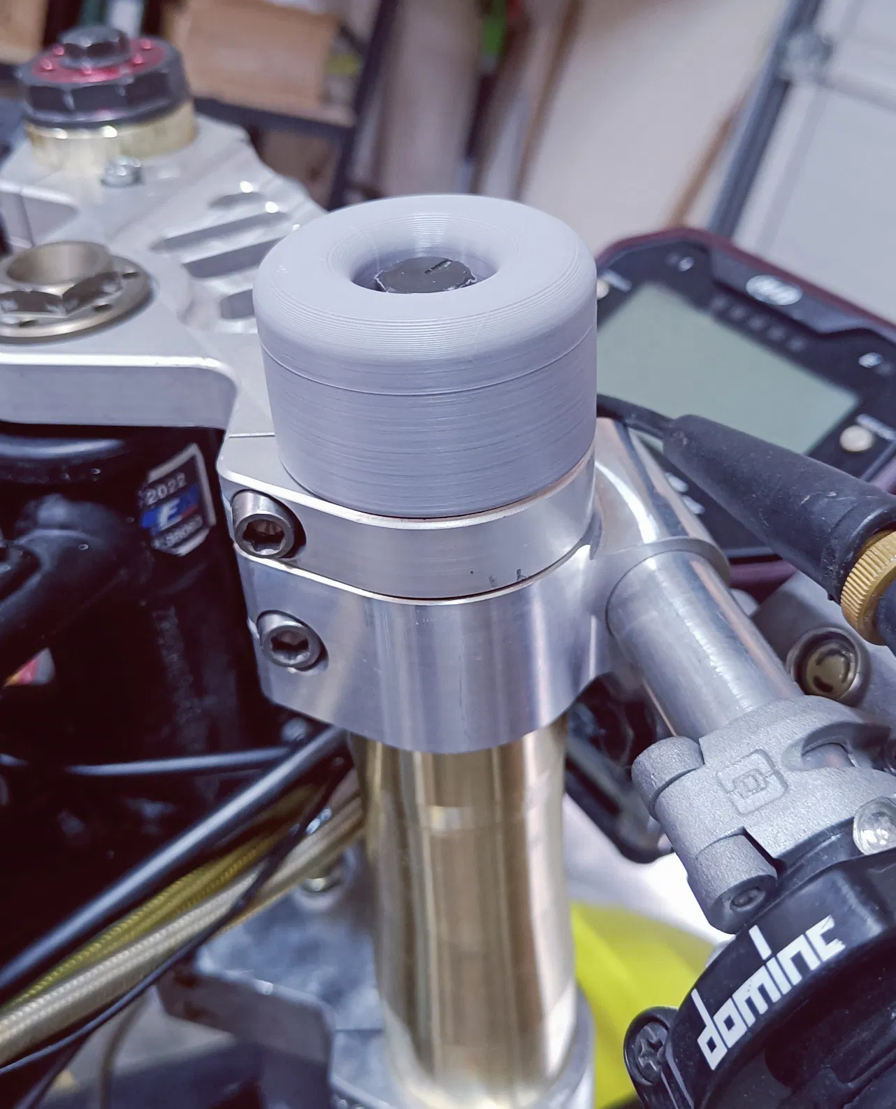 Ốp bảo vệ phuộc trên 45mm cho Ohvale GP0/GP2 (có nắp chỉnh preload). Lắp ôm sát, bắt vào ren ghi-đông bằng ốc M6 x 25mm (đầu tối đa 10mm), độ sâu tối đa 22mm. In PETG/ABS/ASA.