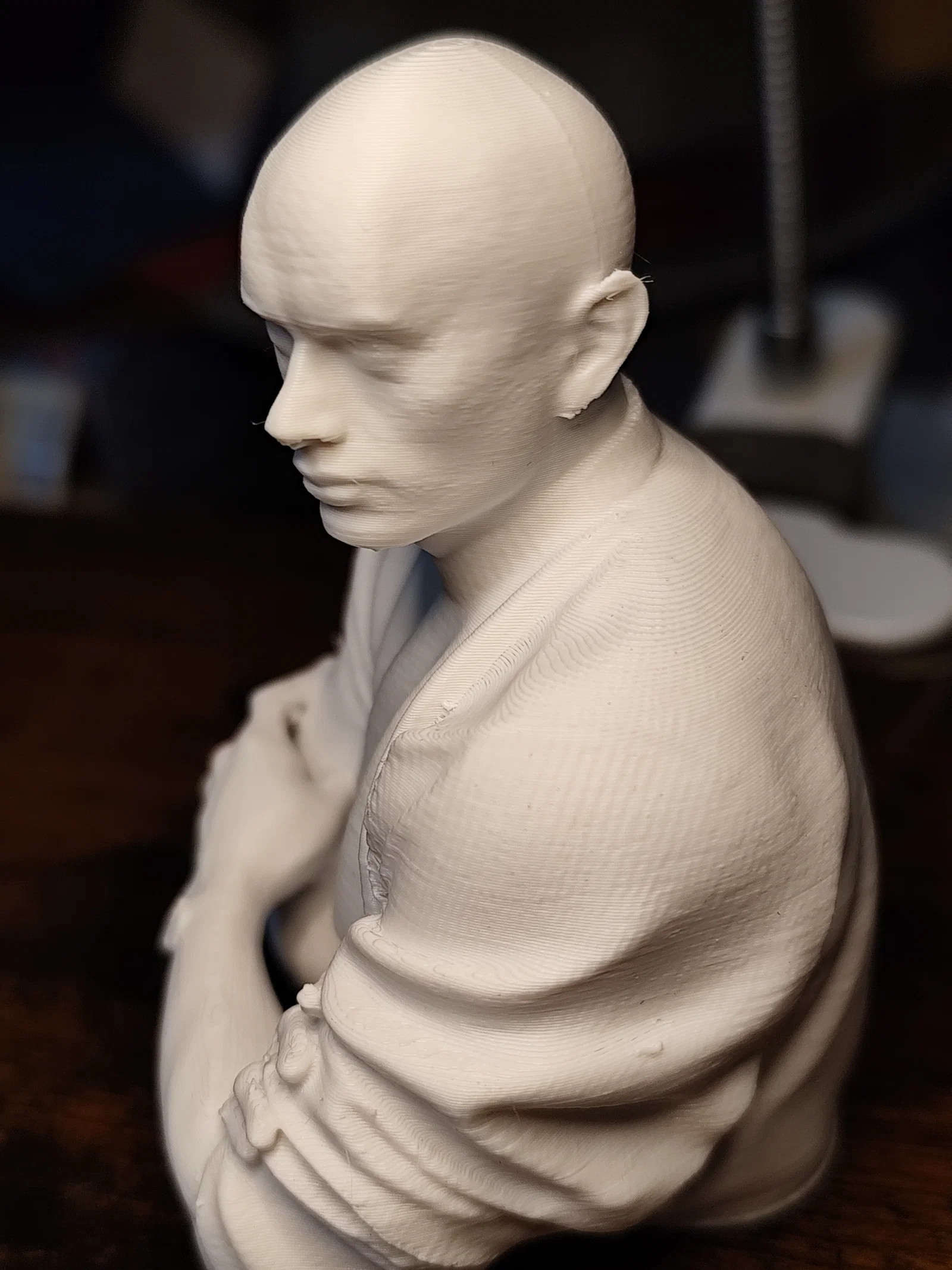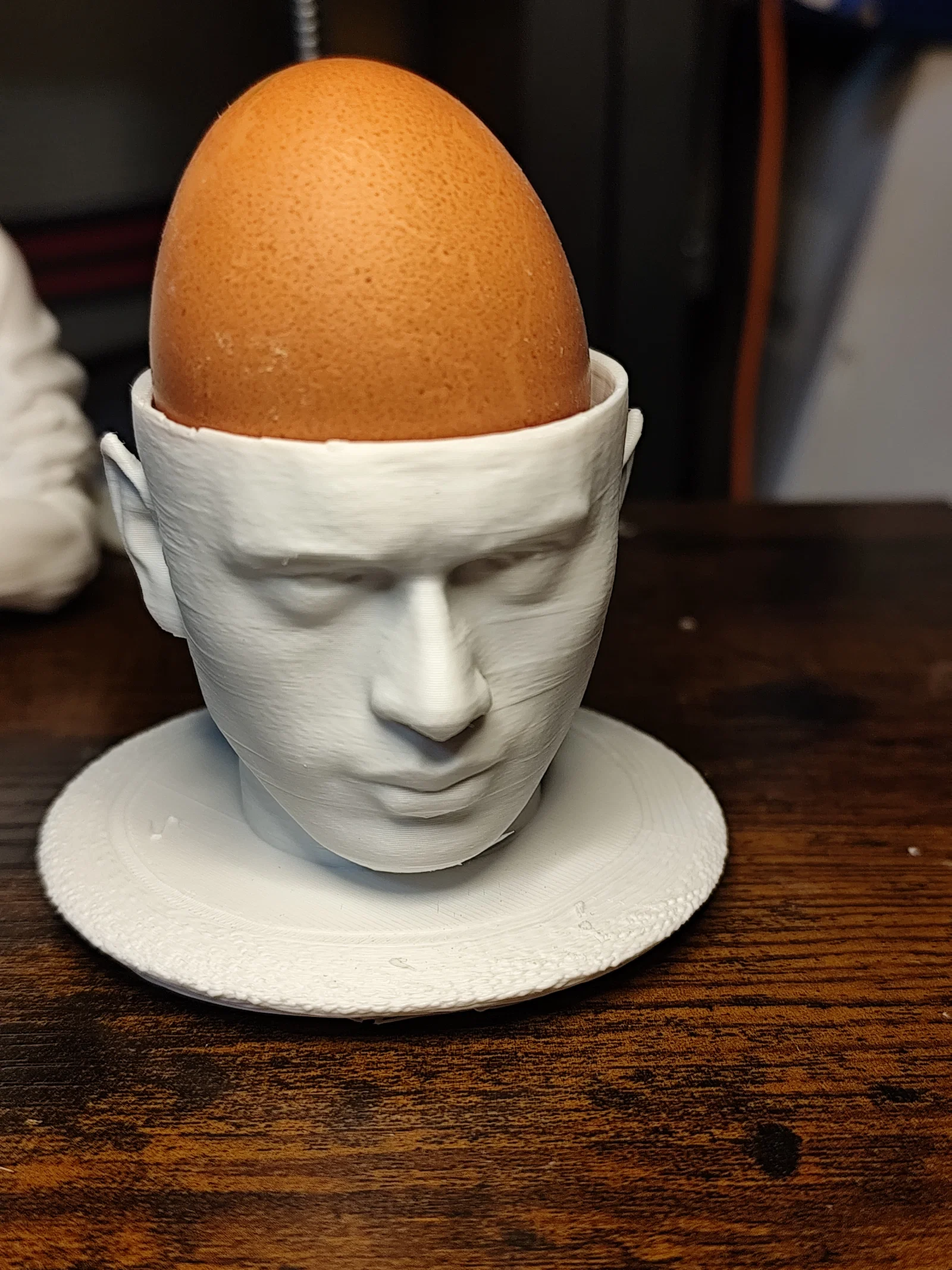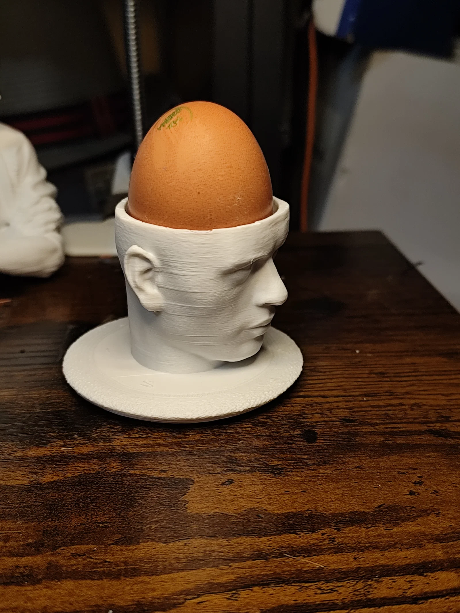 Tác giả định làm Yul Brenner thành một egg cup nhưng nếu đúng tỷ lệ thì phải cao tới 200 mm, nên chỉ giữ lại phần đầu. Khi in nên dùng nhiều support; lần đầu khuỷu tay bị lỗi do set up chưa tối ưu.