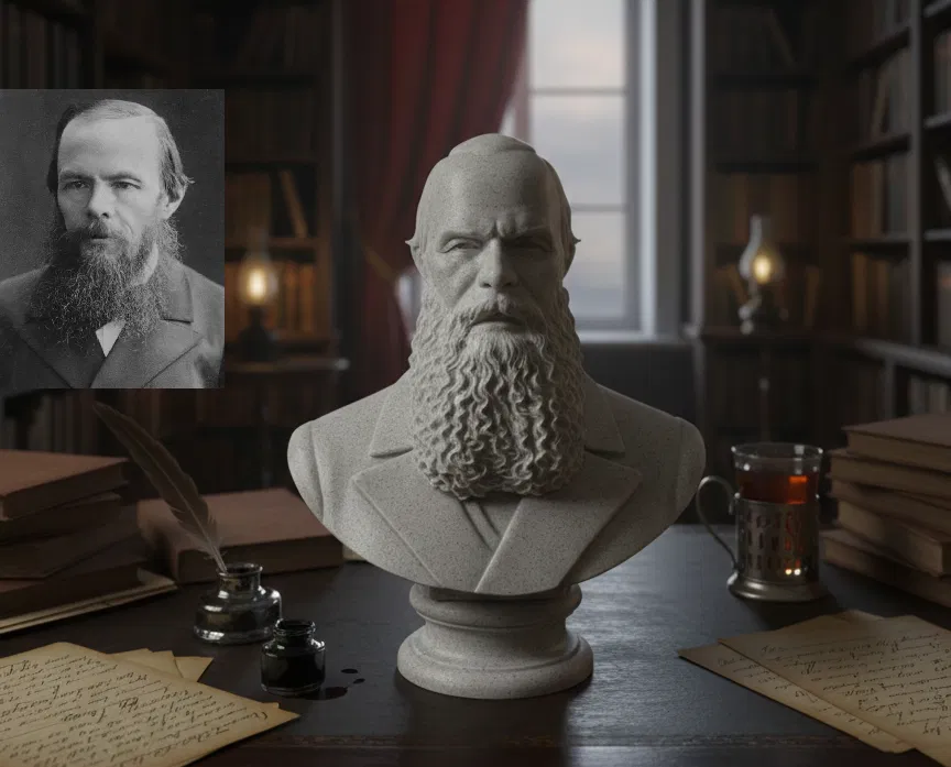 Bức tượng bán thân này mô tả Fyodor Mikhailovich Dostoevsky, một nhân vật lớn của văn học Nga thế kỷ 19, người có tác phẩm ảnh hưởng mạnh mẽ đến triết học, tâm lý học và tiểu thuyết hiện đại. Mẫu được lấy cảm hứng từ bức ảnh mang tính biểu tượng và được nhận diện rộng rãi nhất của ông, vốn đã trở thành hình ảnh tham chiếu “chuẩn” cho diện mạo của Dostoevsky.