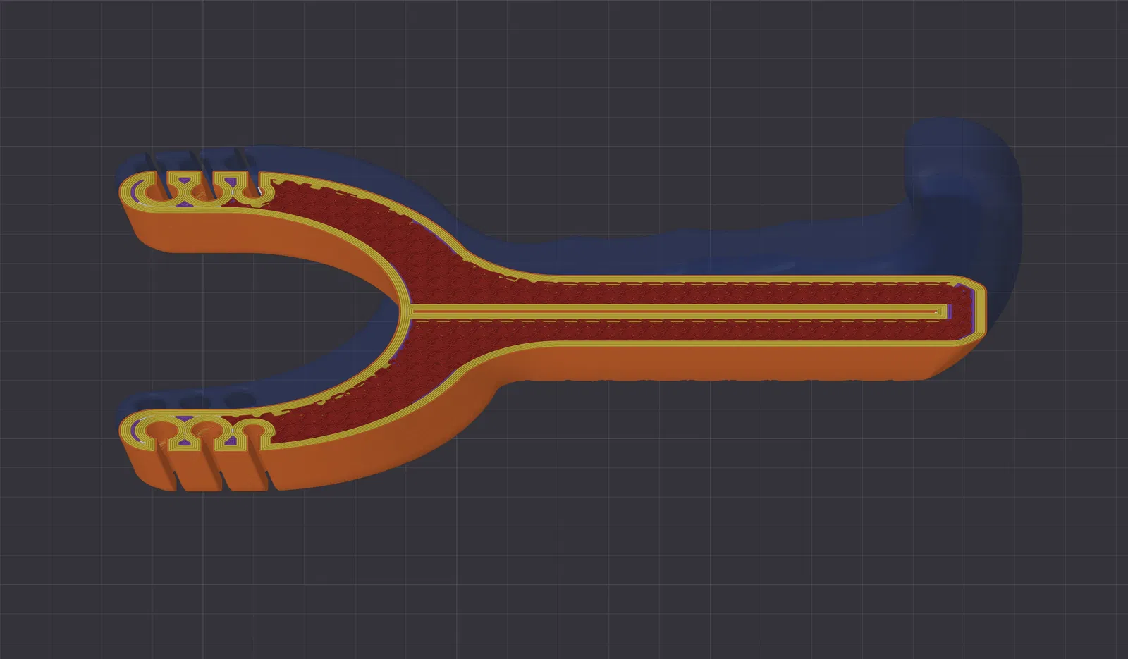 Mình thiết kế với một khoảng rỗng siêu mỏng để bắt buộc máy tạo internal walls bất kể cài đặt infill. Nhờ vậy phần này được gia cường dù bạn để infill thế nào.