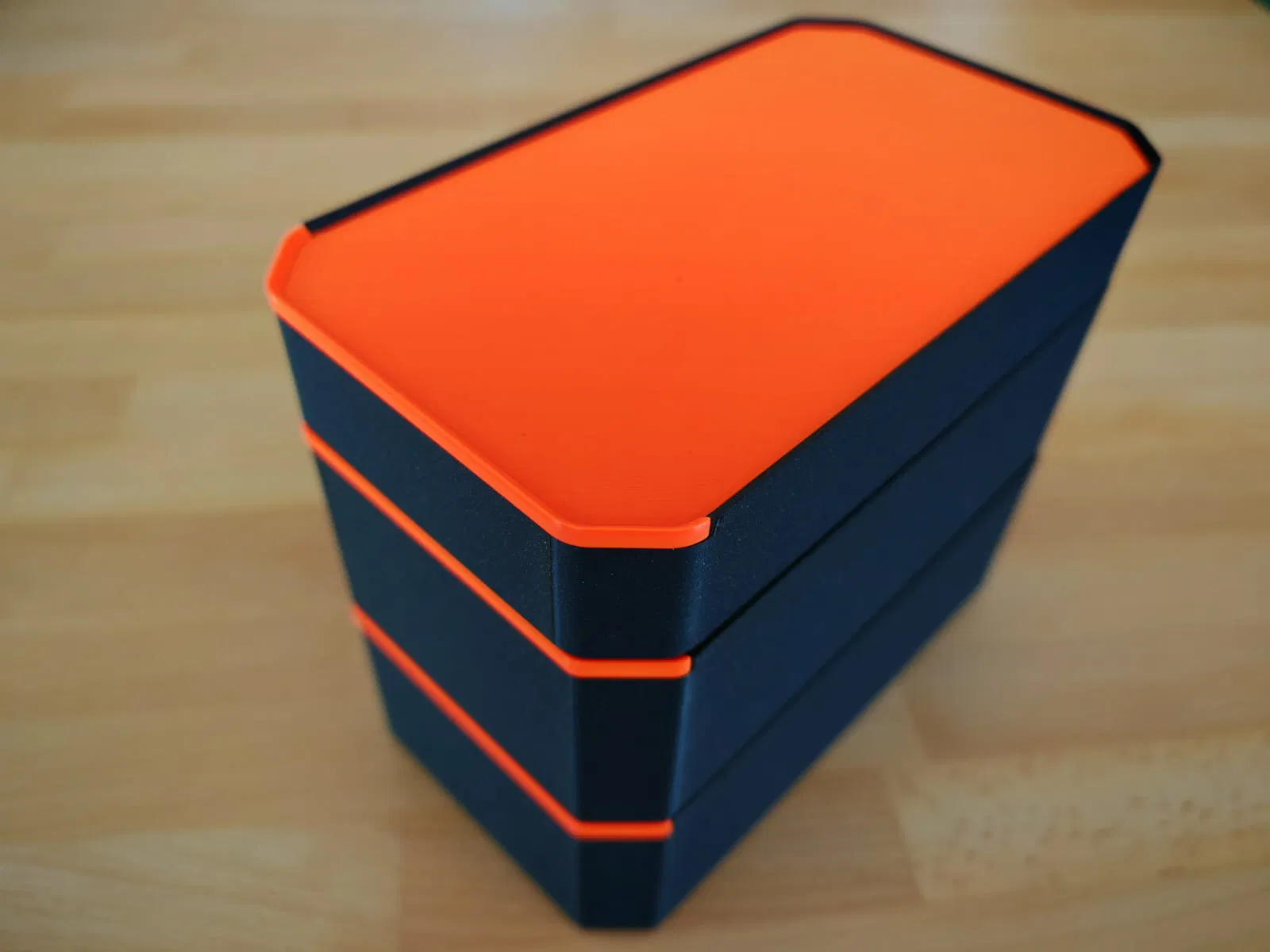 Mẫu hộp parametric với nắp trượt, thiết kế để có thể xếp chồng. Có kèm project FreeCAD để bạn tùy chỉnh kích thước/thông số qua spreadsheet “tab”, phù hợp cho các chỉnh sửa cơ bản.