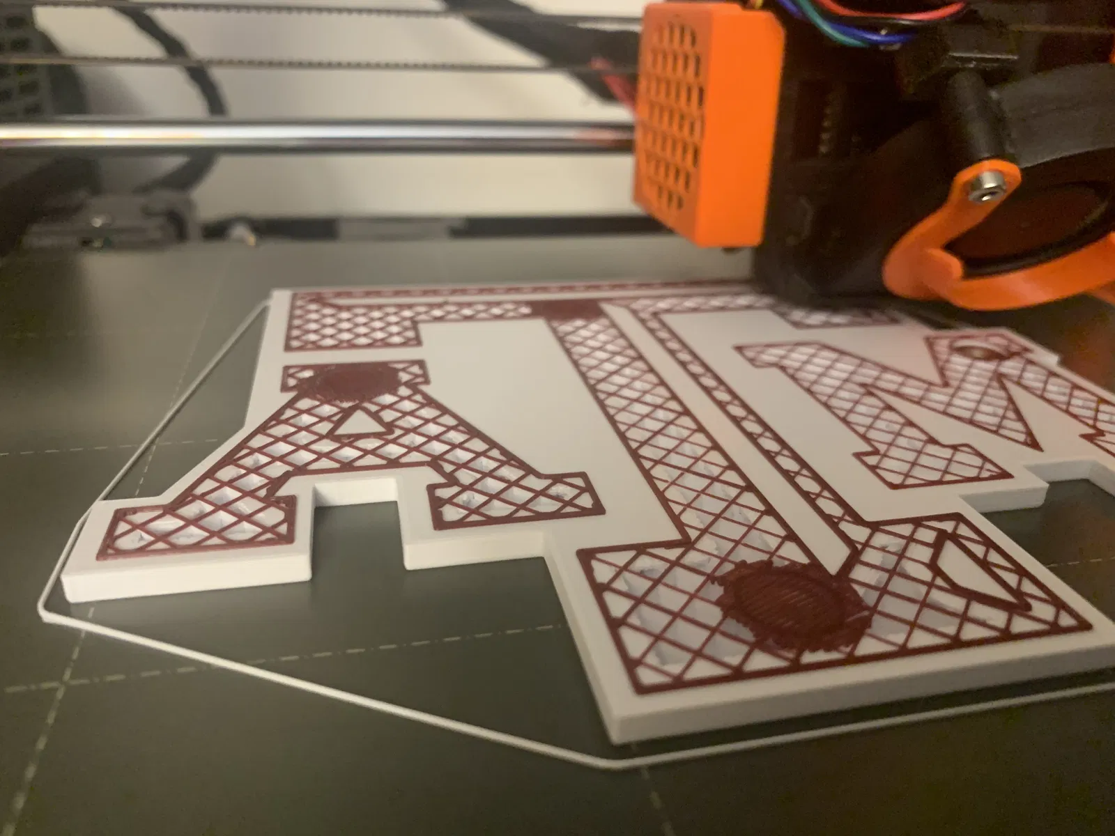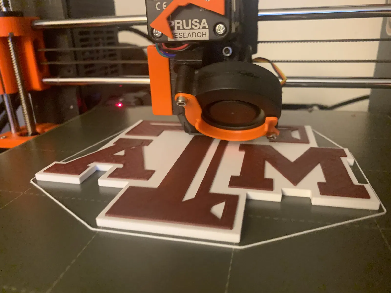 Mình quyết định tự làm thiết kế của mình dựa trên artwork có sẵn online và tạo bốn khoang (cavities) kết thúc đúng tại bước đổi màu. Nếu slice đúng cách, bạn sẽ có thể chèn 4 viên nam châm 8x3mm vào khoang khi máy in pause để đổi filament sang màu maroon. Bên Filacube có một màu TAMU maroon rất đẹp.