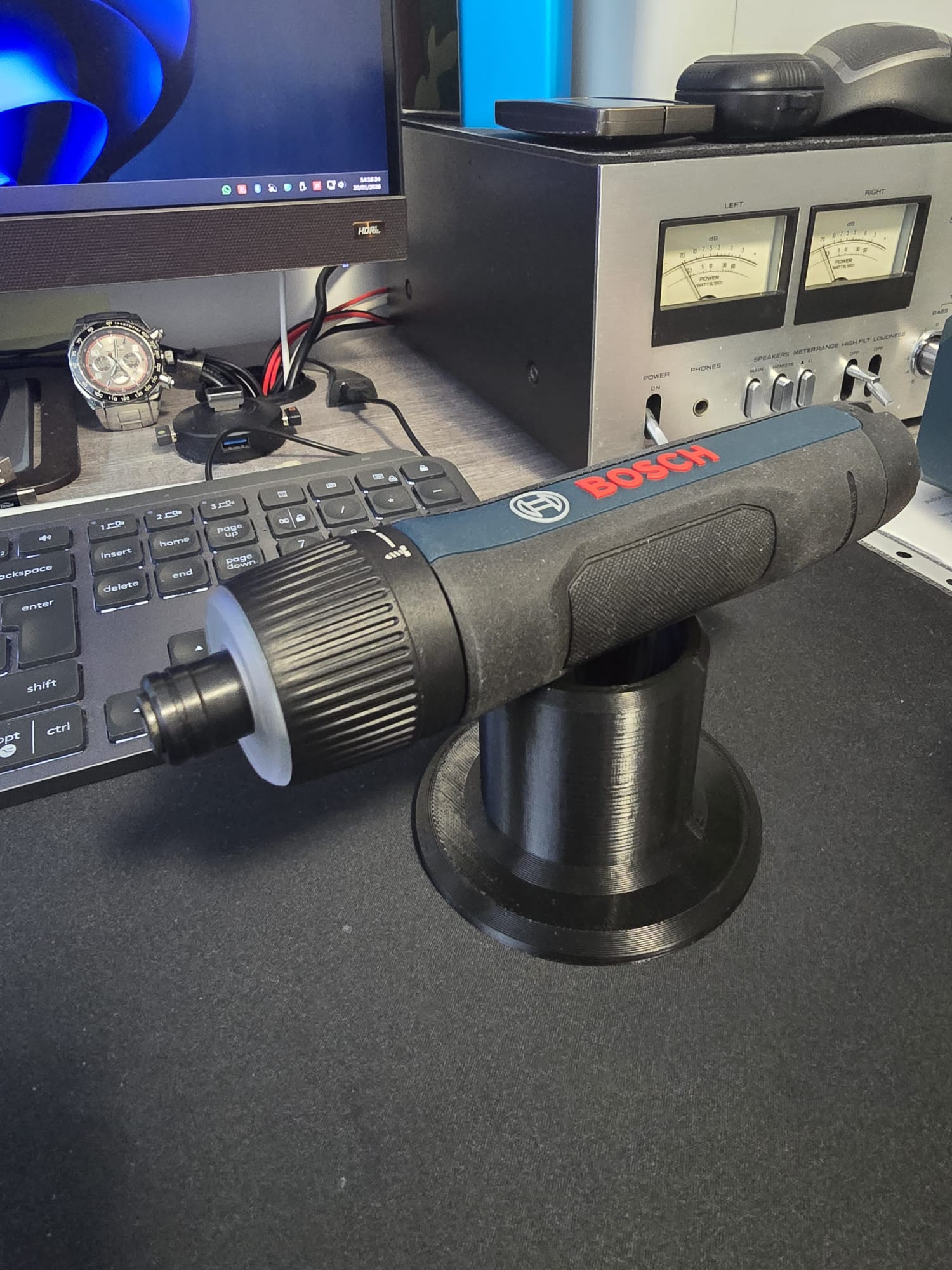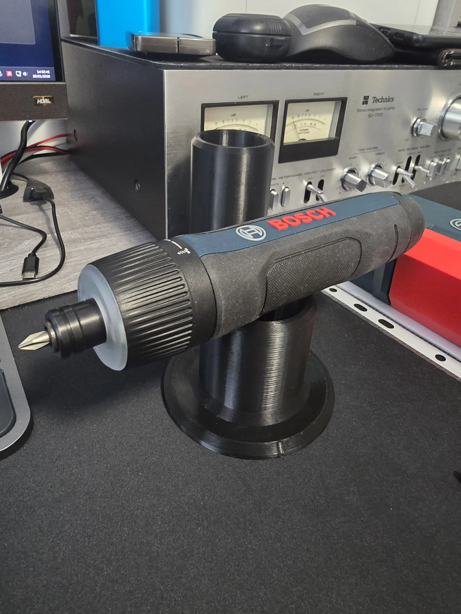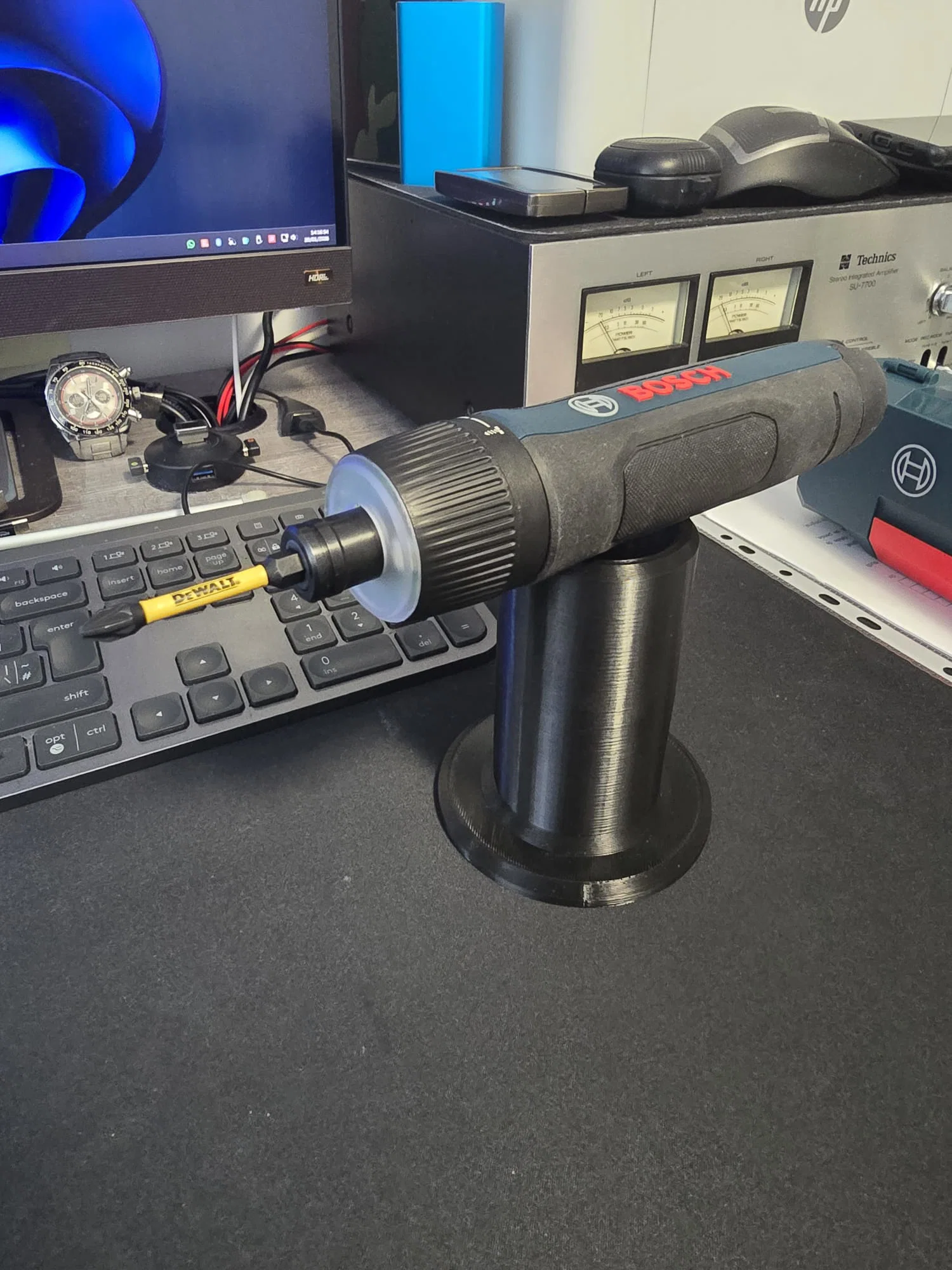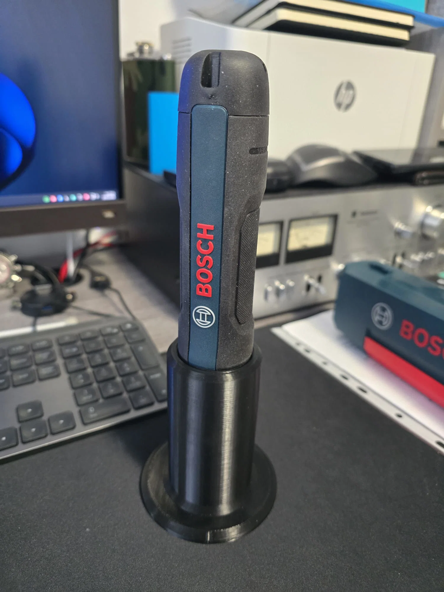 Mình làm một cái stand cho tua vít điện BOSCH GO 3 để có thể đặt đứng theo phương dọc. Có 3 phiên bản: một bản chỉ cho GO 3, một bản cho GO 3 khi đã cắm sẵn một standard bit, và bản thứ ba cho GO 3 khi đã cắm sẵn bit dài 5.7 mm. Nếu dung sai bị khít quá, bạn có thể chỉnh trong slicer bằng cách tăng X và Y thêm 0.2 mm, thường vậy là đủ.