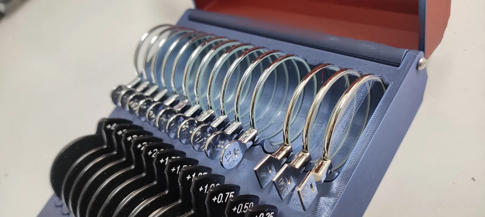 Mẫu hộp Box Optometry Lens dùng để cất gọn tối đa 30 kính thử (trial optometry lens). Thiết kế bản lề dùng 2 vít M2.5x10; gợi ý in: layer 0.2, 3 wall, 10% infill, tree supports cho nắp.