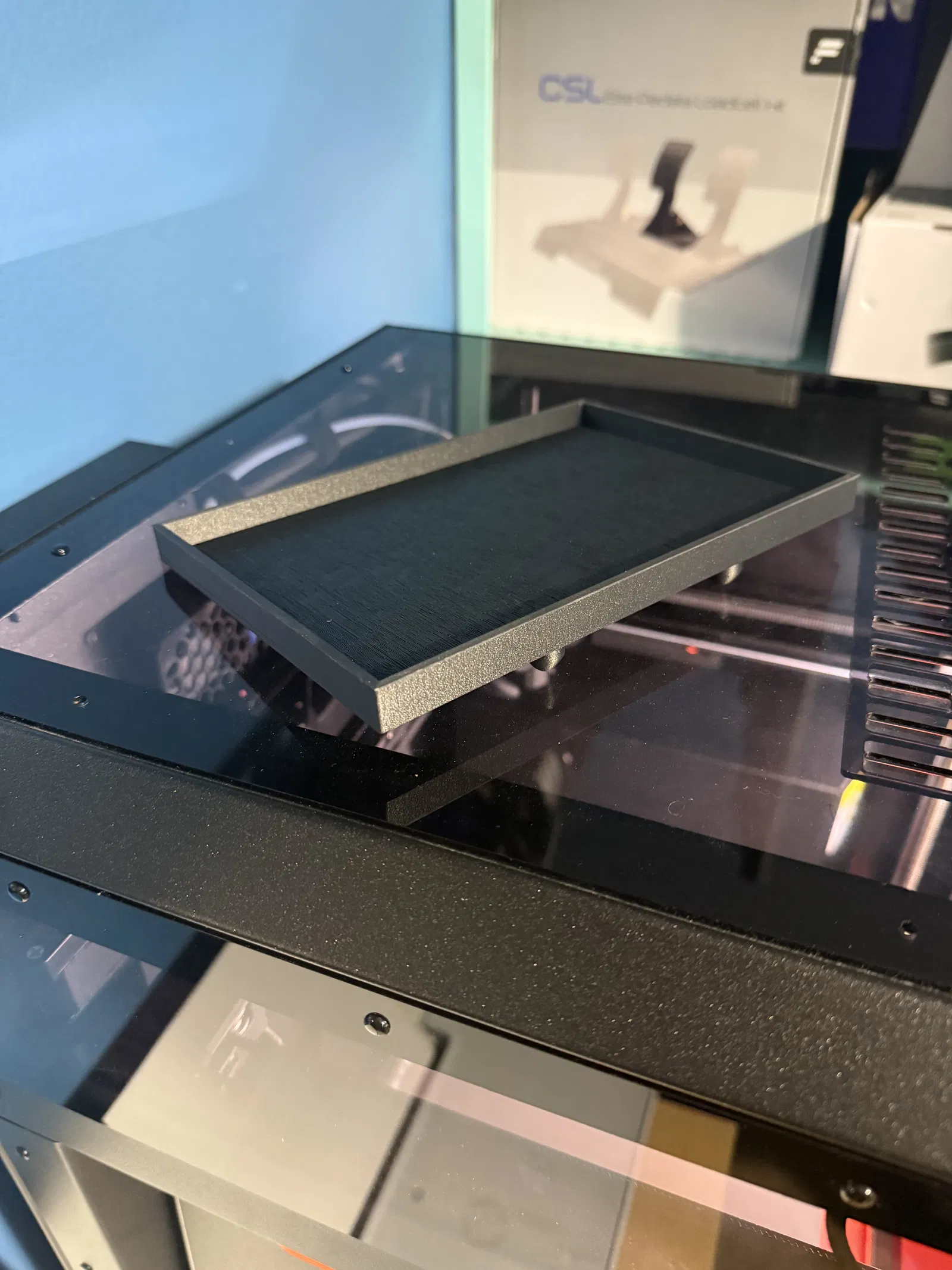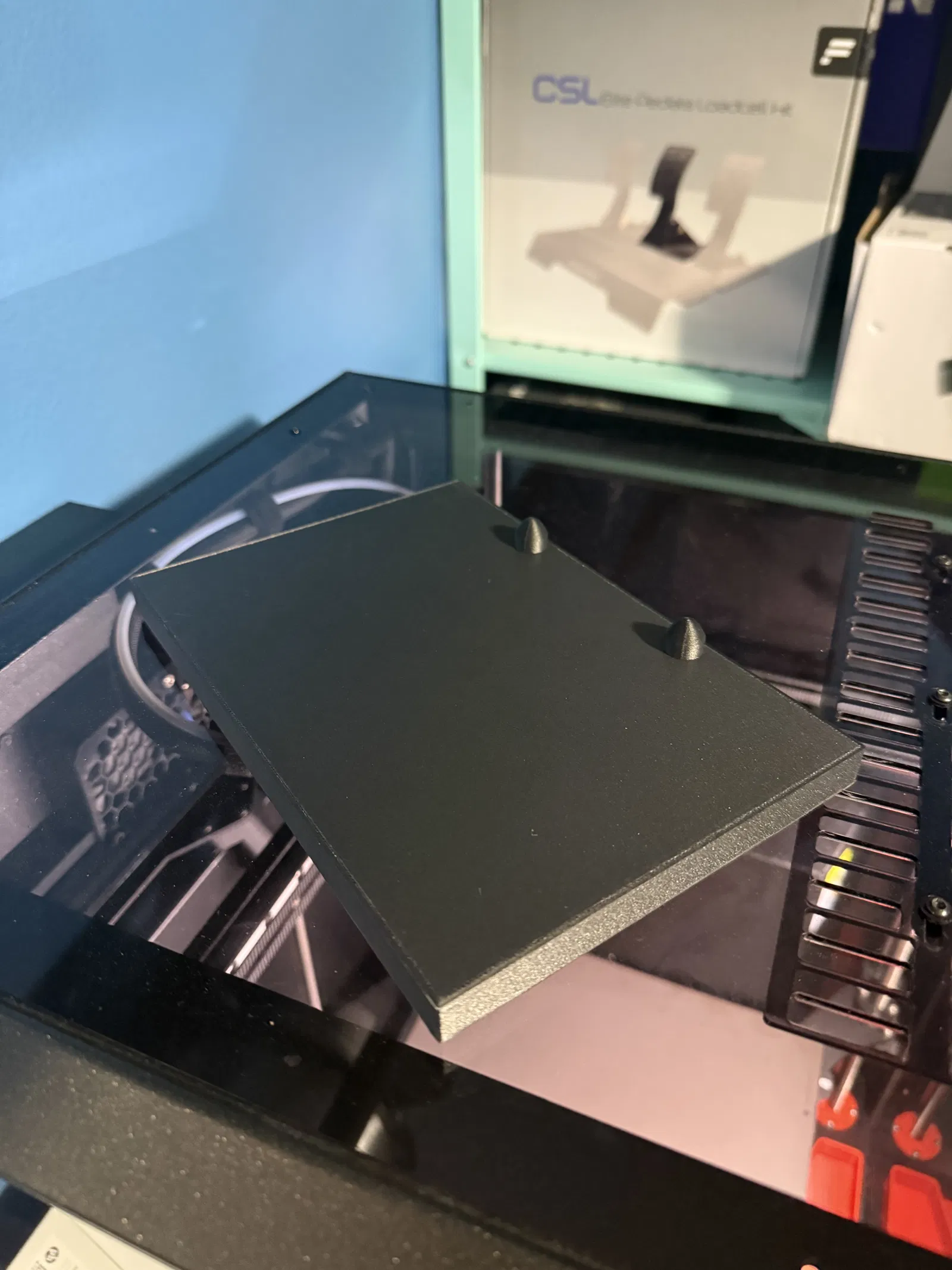 In bằng PC-CF. Mình in cái tray lật ngược, còn hold down adapter thì đặt nằm ngang (on it's side). 3 walls, honeycomb infill 15%. Mình phải thêm brim khi in tray vì bị cong vênh (warping) trong lúc in. Thiết kế bằng Tinkercad.