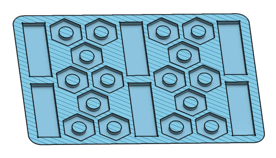 Sau khi in xong mình mới nhận ra phần vật liệu đặc giữa mặt trên của các đai ốc và bề mặt trên cùng hơi mỏng, làm bề mặt phía trên bị xấu (như thấy ở hình thứ hai). Mình đã tăng thêm chiều cao cho chi tiết; hy vọng sẽ giảm/khắc phục được vấn đề này.