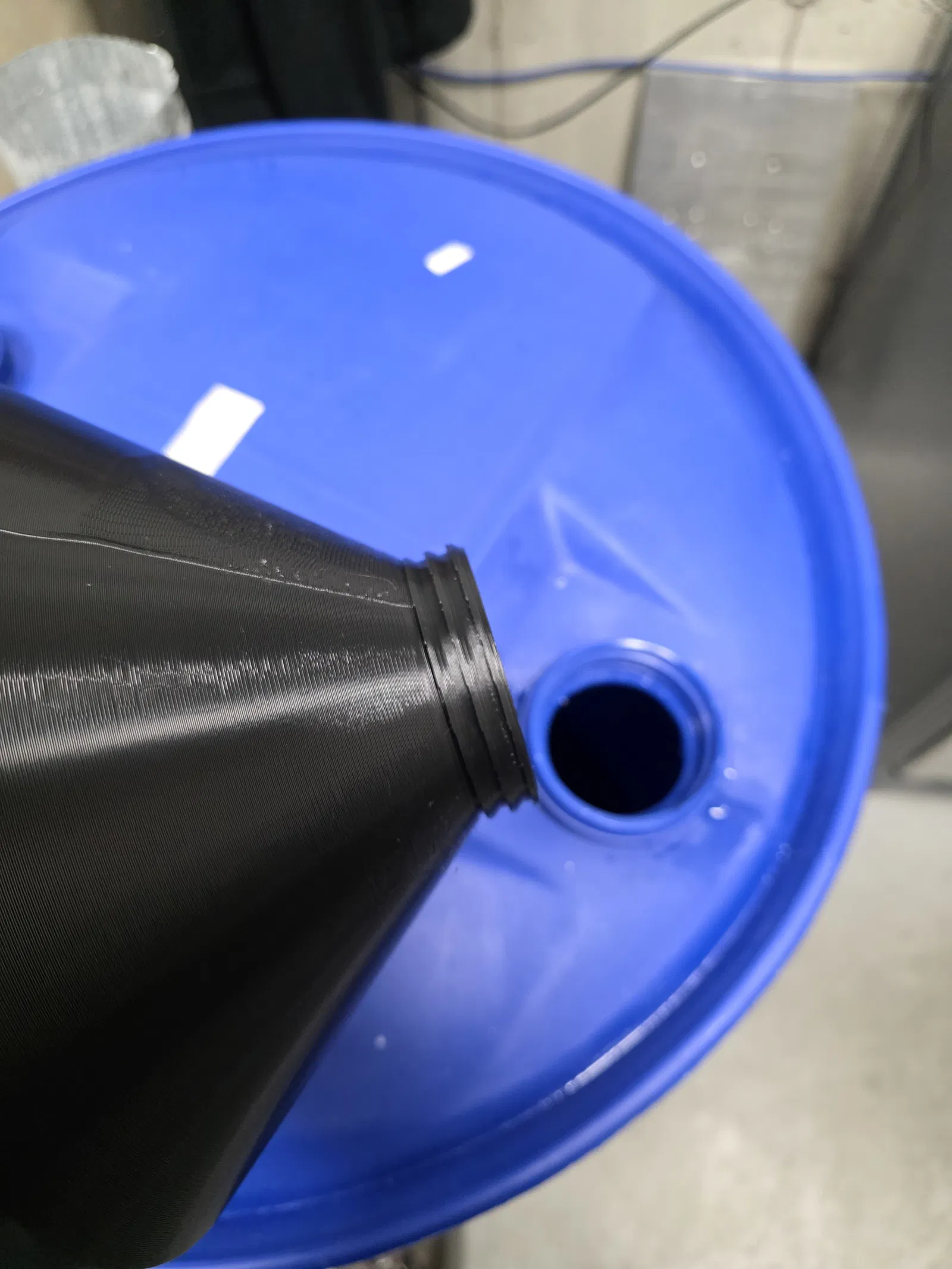 Phễu đường kính 8" có lỗ thông hơi, thiết kế để khớp với kiểu ren “lạ” trên thùng phuy nhựa (poly drums). Gợi ý in ABS với 4 walls và 15% gyroid infill.
