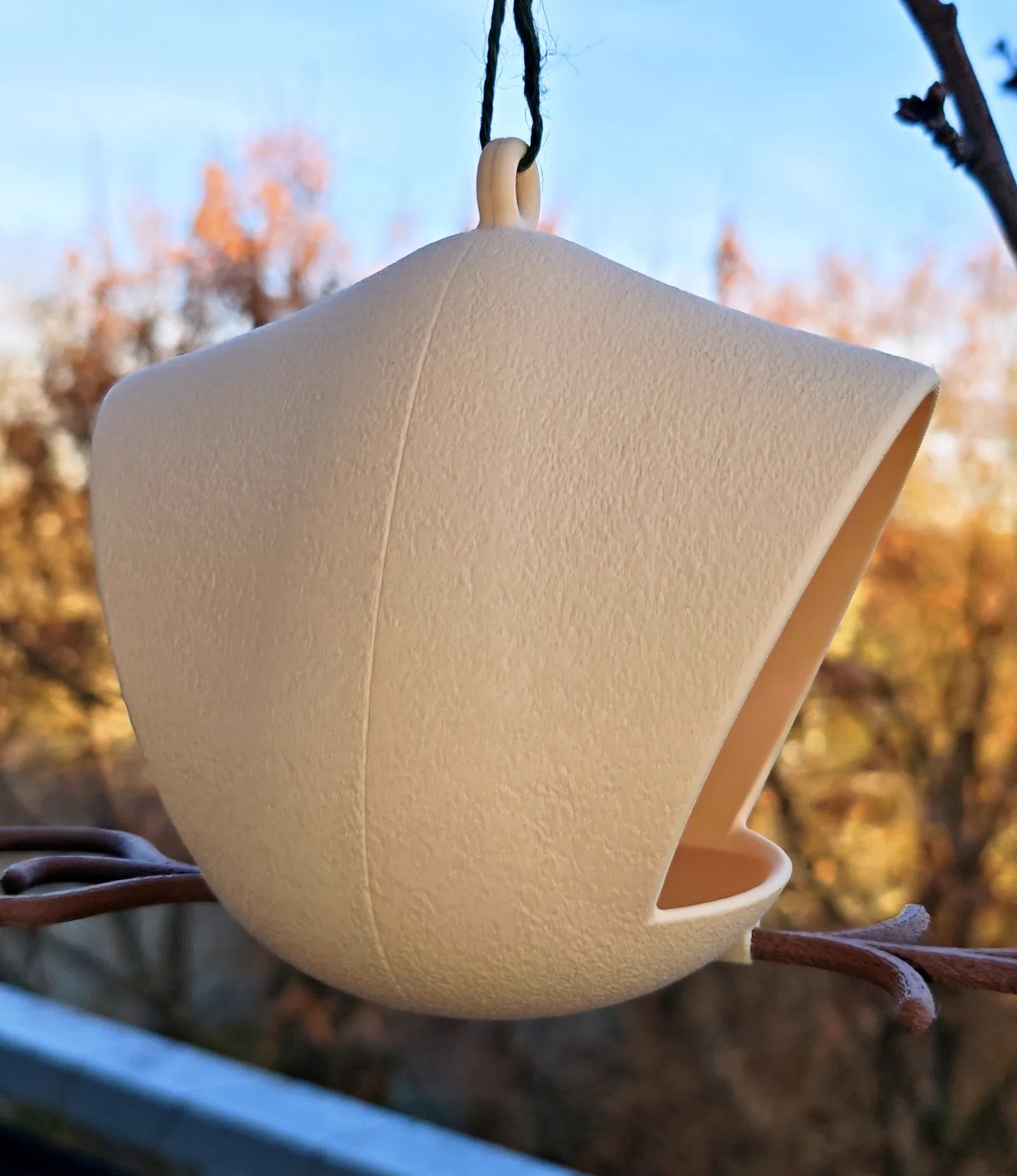 PLA vẫn dùng được, nhưng để ngoài trời có thể nhanh xuống hơn. Trong hình, mình dùng Bambulab PETG HF (cream) cho bird feeder và PLA Matte (Dark brown) cho phần cành.