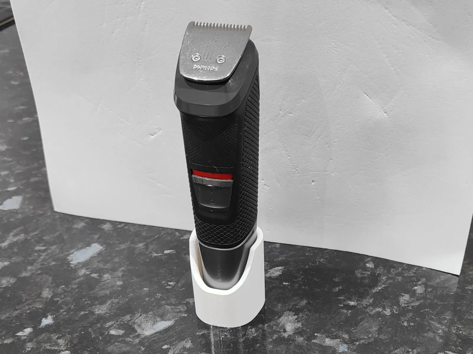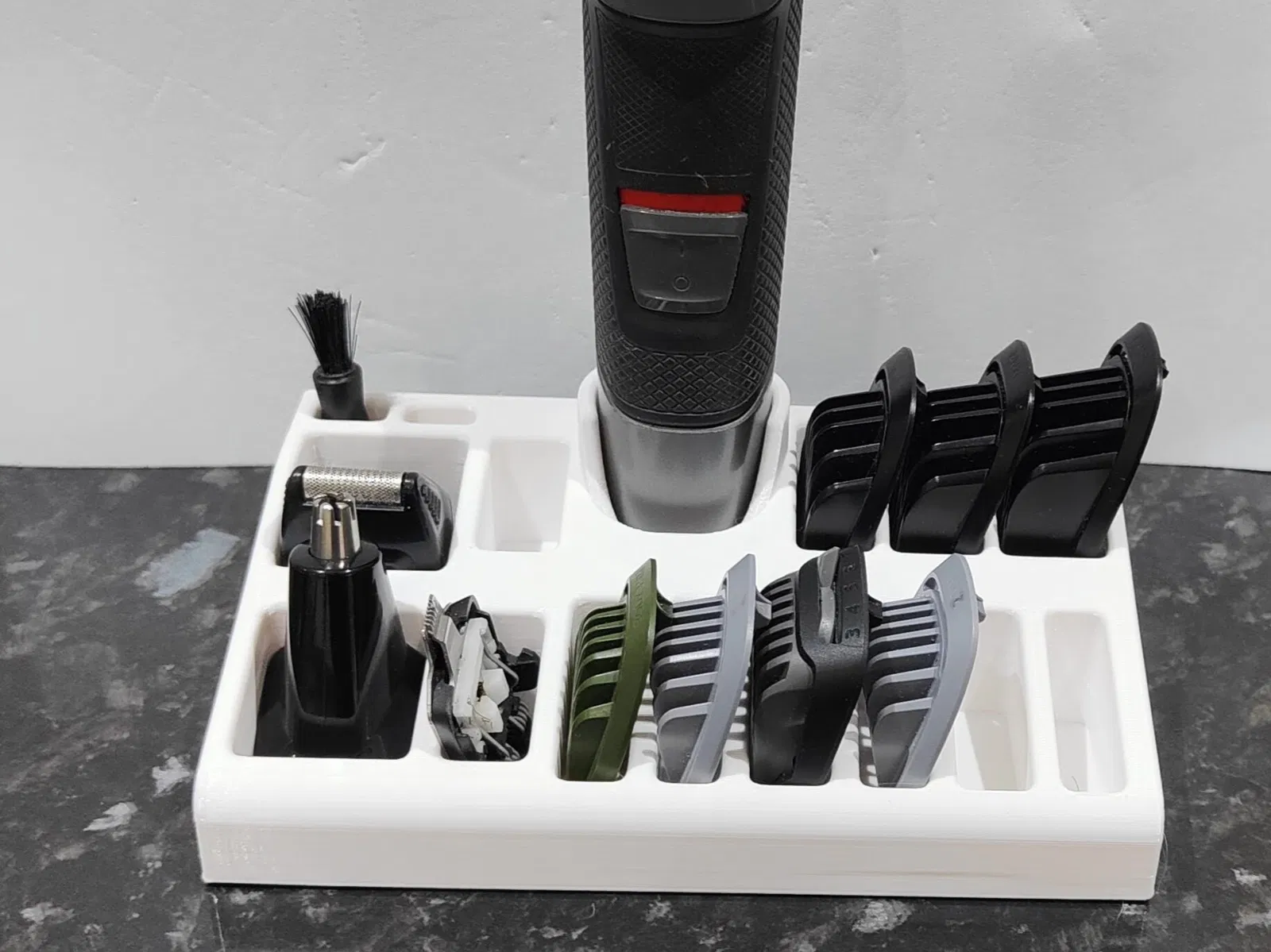 Bản remix kệ/khay để gom Philips Multigroom 5000 Series Trimmer và các đầu gắn/phụ kiện vào một chỗ, có chừa khe trống để mở rộng. Kèm miếng test ~7g để thử độ khớp trước khi in full; khuyến nghị PETG, PLA vẫn dùng ổn.