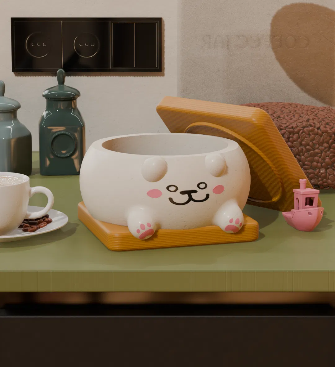 Hộp đựng dễ thương, rộng 136 mm và cao 84 mm. Gồm 2 phần: thân (base) và nắp (lid). Có 4 biến thể thiết kế. Ngoài ra còn có file để in màu 4 màu. Extruder1 - nâu, Ex2 - trắng, Ex3 - đen, Ex4 - hồng.
