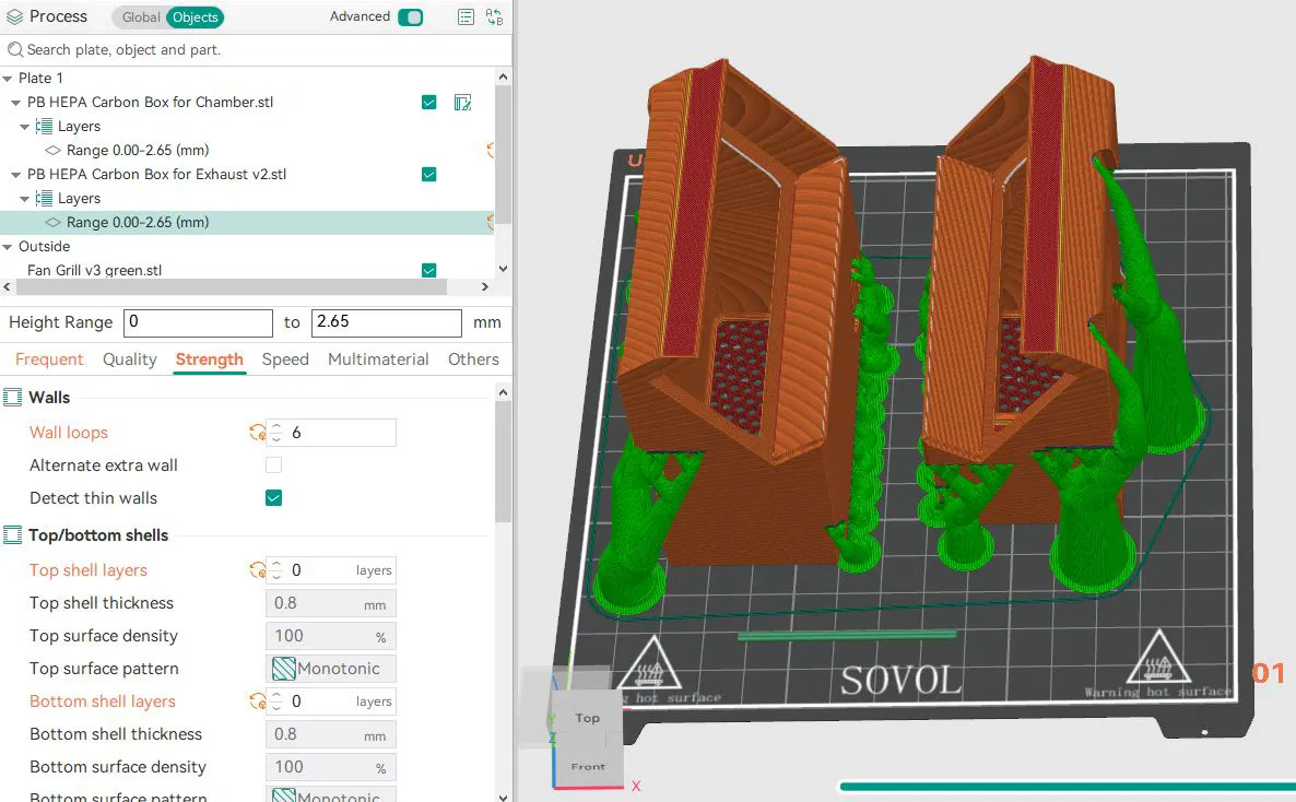 Với HEPA carbon box, dùng height range modifier trong slicer. 0–2,65mm — mình dùng honeycomb 25%.