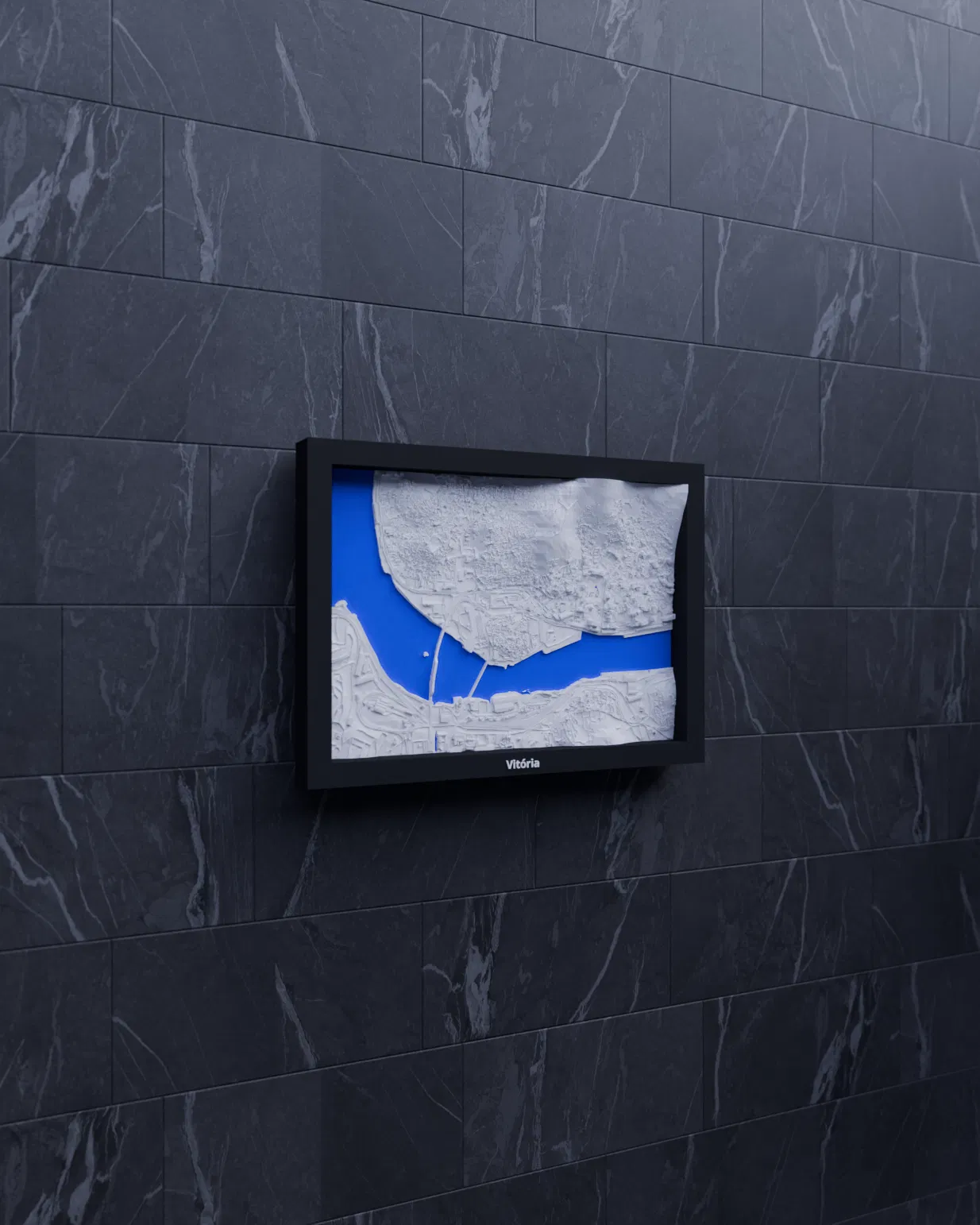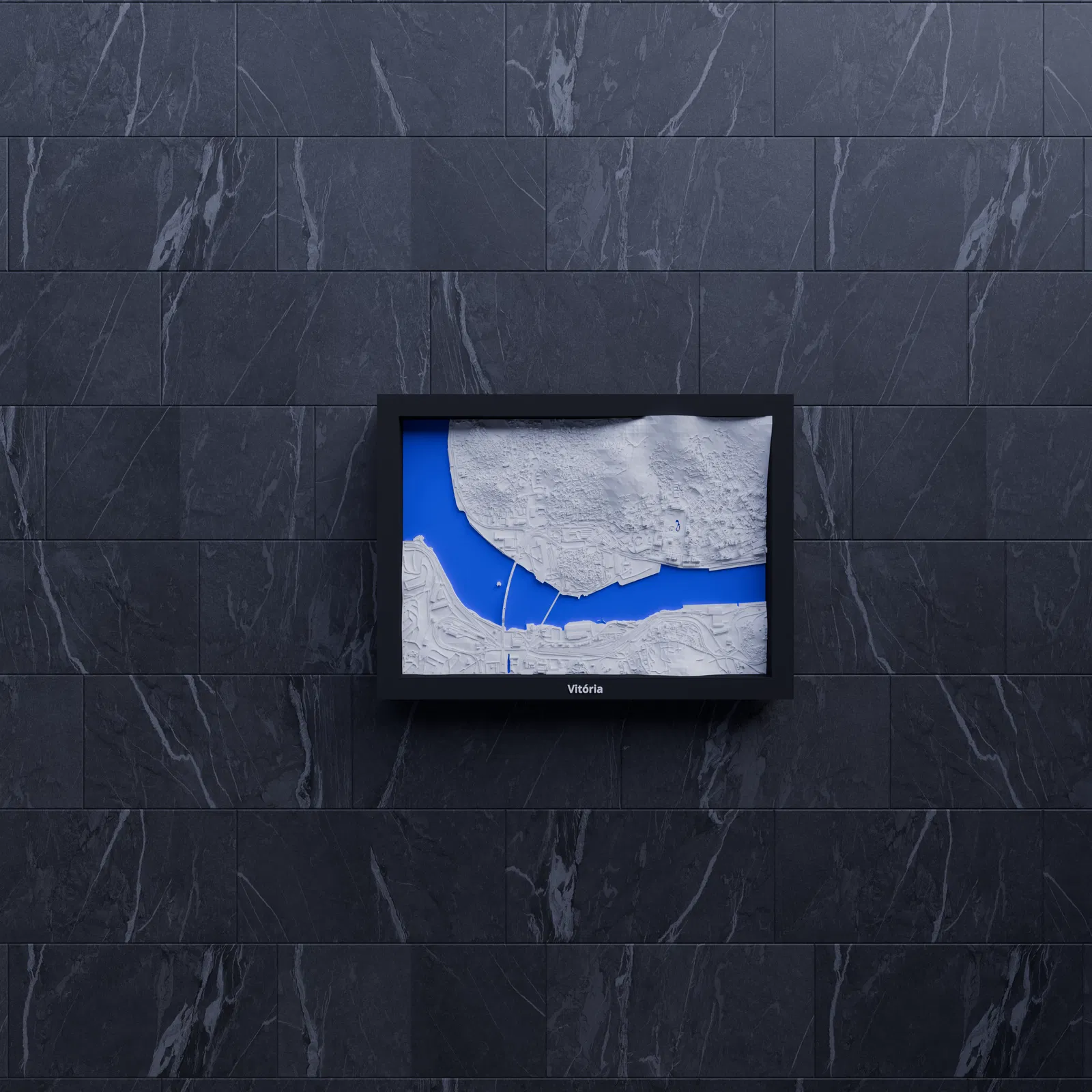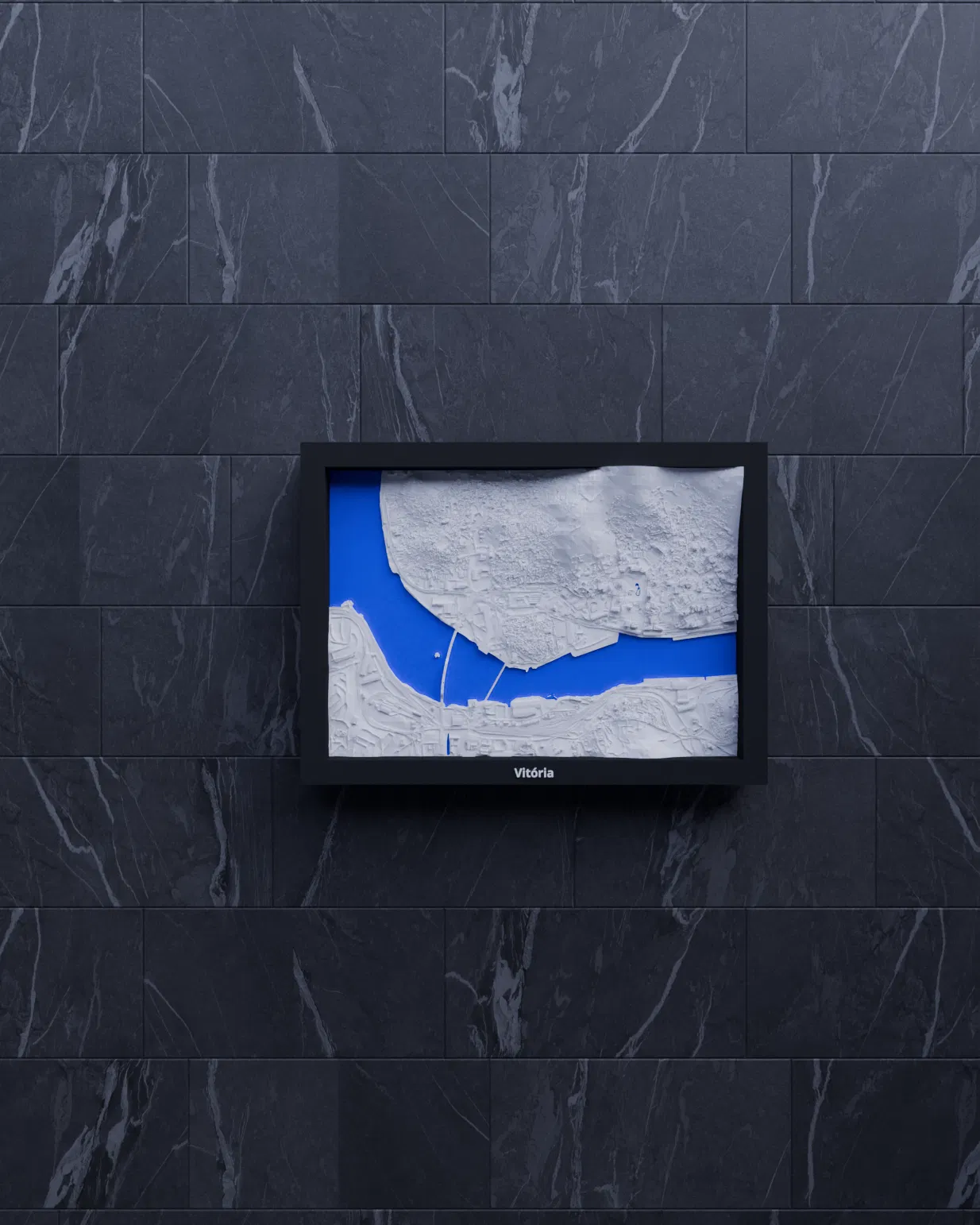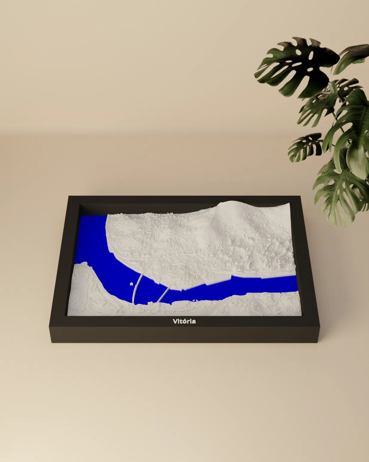Mô hình thu nhỏ địa hình 3D của Vitória (Brazil) dựa trên dữ liệu địa lý, thu nhỏ từ 2.814 x 1.961 km xuống 170.5 x 119.5 mm. Có nhiều frame kèm lỗ treo, phù hợp trưng bày, học tập hoặc làm quà.