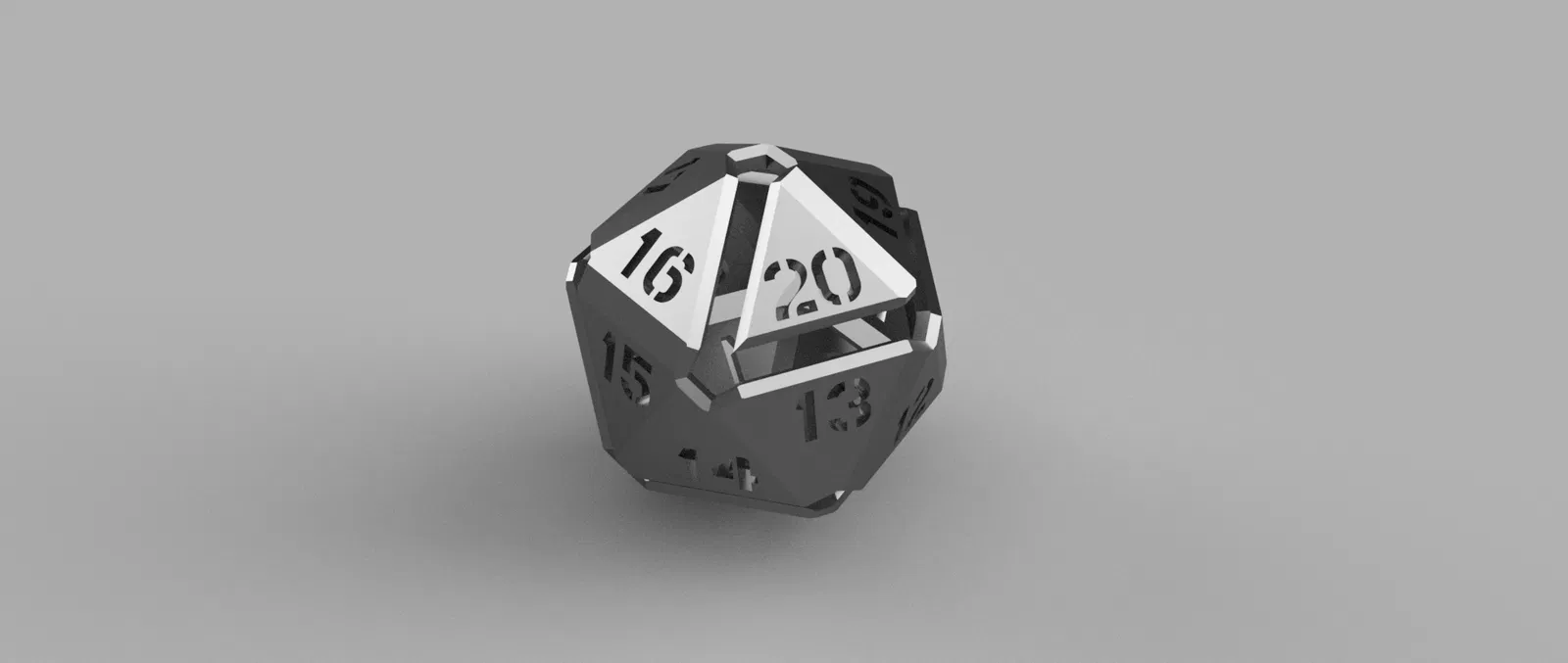 Ban đầu mình tính in một con D20 custom bằng kim loại, nhưng nghĩ lại kim loại đặc thì vừa nặng vừa tốn kém. Nên mình chuyển sang ý tưởng làm dạng shell cho một con D20 bình thường, mà rồi phát hiện ra kiểu shell bọc kín hoàn toàn cũng không in được. Từ đó loay hoay một hồi thì ra được thiết kế này. Dù vậy, mình vẫn chưa chắc mẫu này có in được trên máy FDM hay SLA không. 🤔