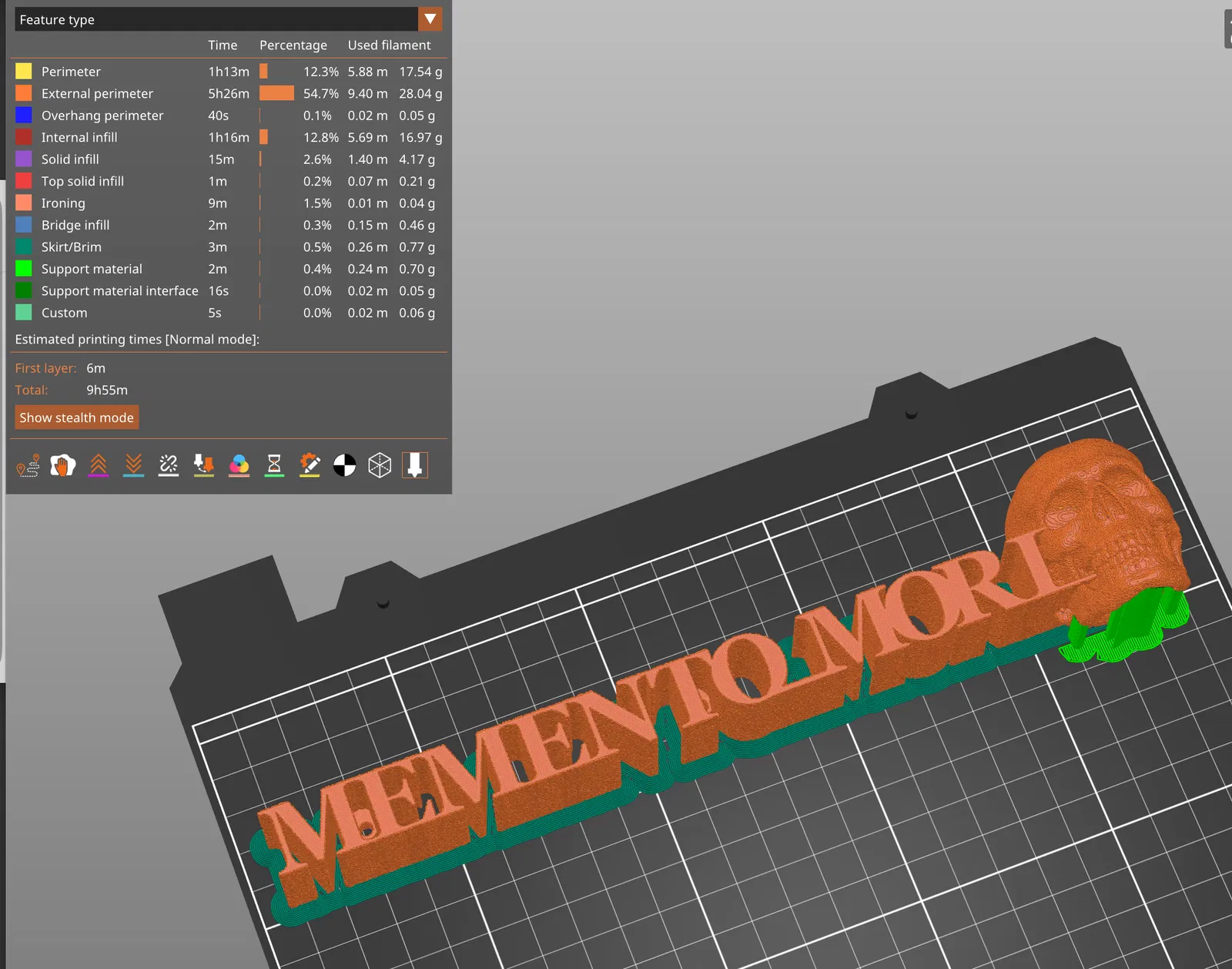 Mẫu chữ treo tường “Memento Mori”, kèm gcode với thiết lập fuzzy skin và ironing. Tác giả treo phía trên nón bảo hiểm sau một tai nạn xe máy để làm điểm nhấn và nhắc nhở.