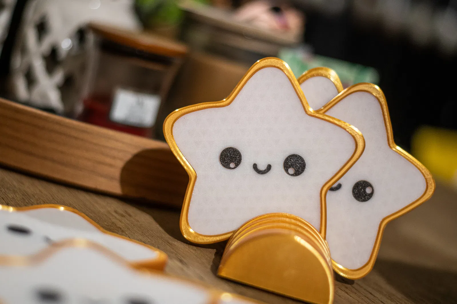 Bộ lót ly hình ngôi sao dễ thương, xếp chồng gọn gàng kèm đế. Thiết kế tối ưu để in dễ, không cần supports, cho bề mặt sạch đẹp ngay cả trên máy in entry level. Kích thước vừa mug tiêu chuẩn, hợp in làm quà.