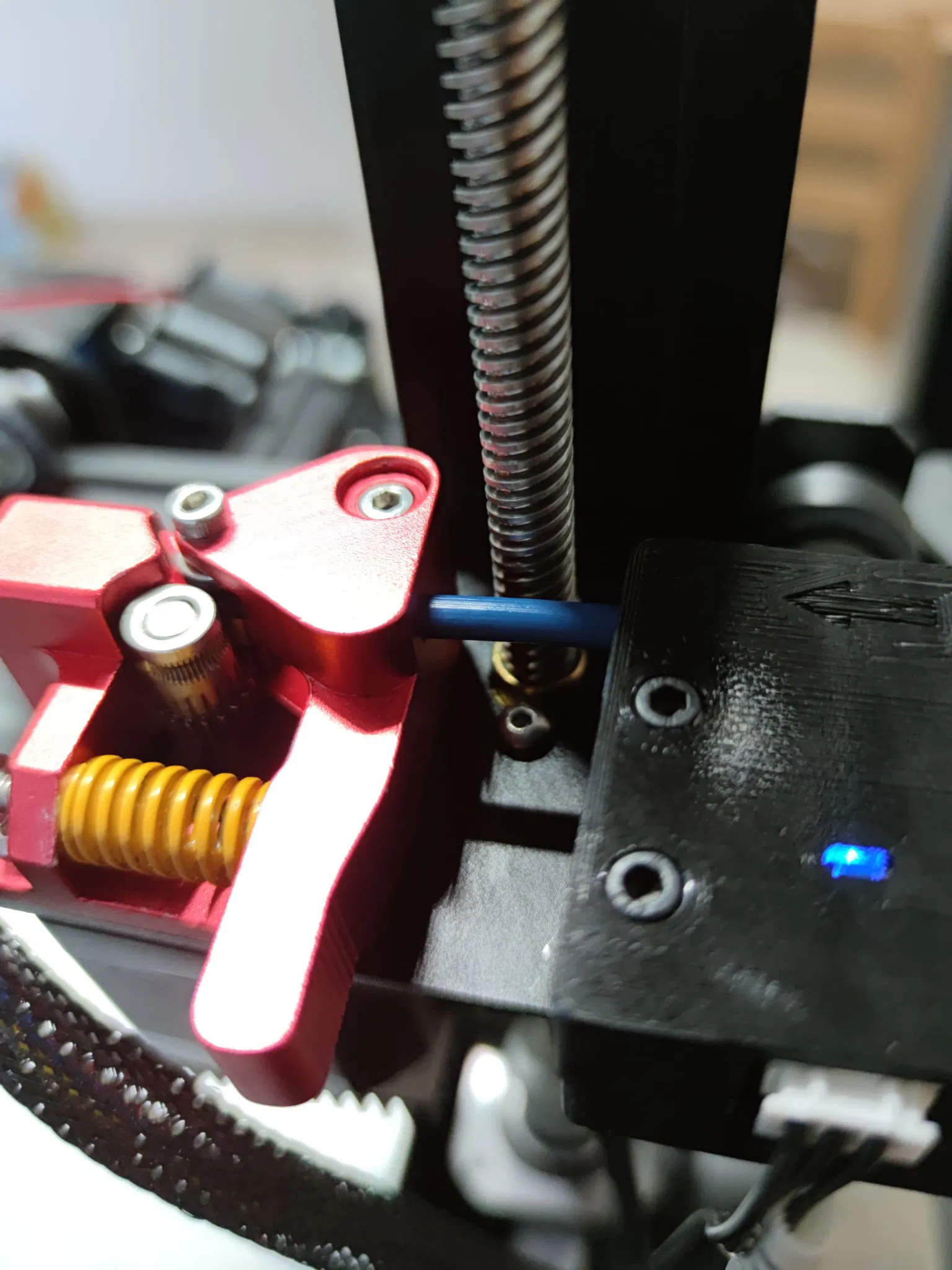 Mình khuyên nên dùng mũi khoan M4 để làm sạch lỗ xuyên cho ống PTFE, vì hướng in và setting in có thể làm kích thước bị sai lệch chút. Mình muốn kiểu pressure-fit vừa khít, chứ không phải ép tới mức làm nát ống.