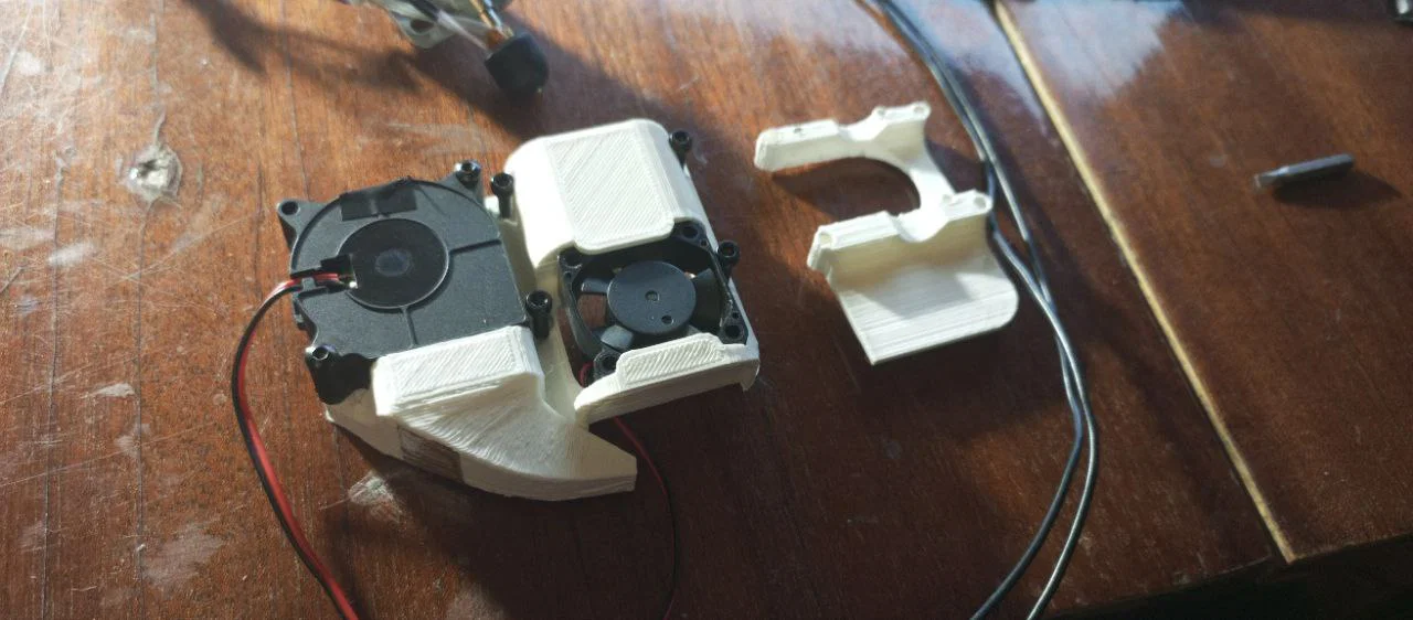 Các chi tiết có thể in bằng filament PLA; sẽ không gặp vấn đề quá nhiệt. Tuy nhiên, khuyến nghị dùng các loại nhựa chịu nhiệt tốt hơn như: PETG và SBS. (Các ví dụ này dựa trên khả năng đã được kiểm chứng thực nghiệm khi in trên máy K10. Nếu bạn có máy khác có thể in được các chi tiết bằng nhựa chịu nhiệt tốt hơn, thì nên dùng loại đó.) Việc lắp ráp nên thực hiện đúng như trong hình. Để bắt các chi tiết, bạn sẽ cần ốc M3: 16mm x 4 và 20mm x 2, và bạn cũng cần mua thêm một quạt turbofan 4020 (bắt buộc 12V!). Trong lúc lắp, dây/đầu cắm của quạt zin cần được cắm vào cổng trống duy nhất trên board, còn turbofan mới thì cắm vào vị trí vừa trống đó. Không cần chỉnh sửa file cấu hình hay firmware.