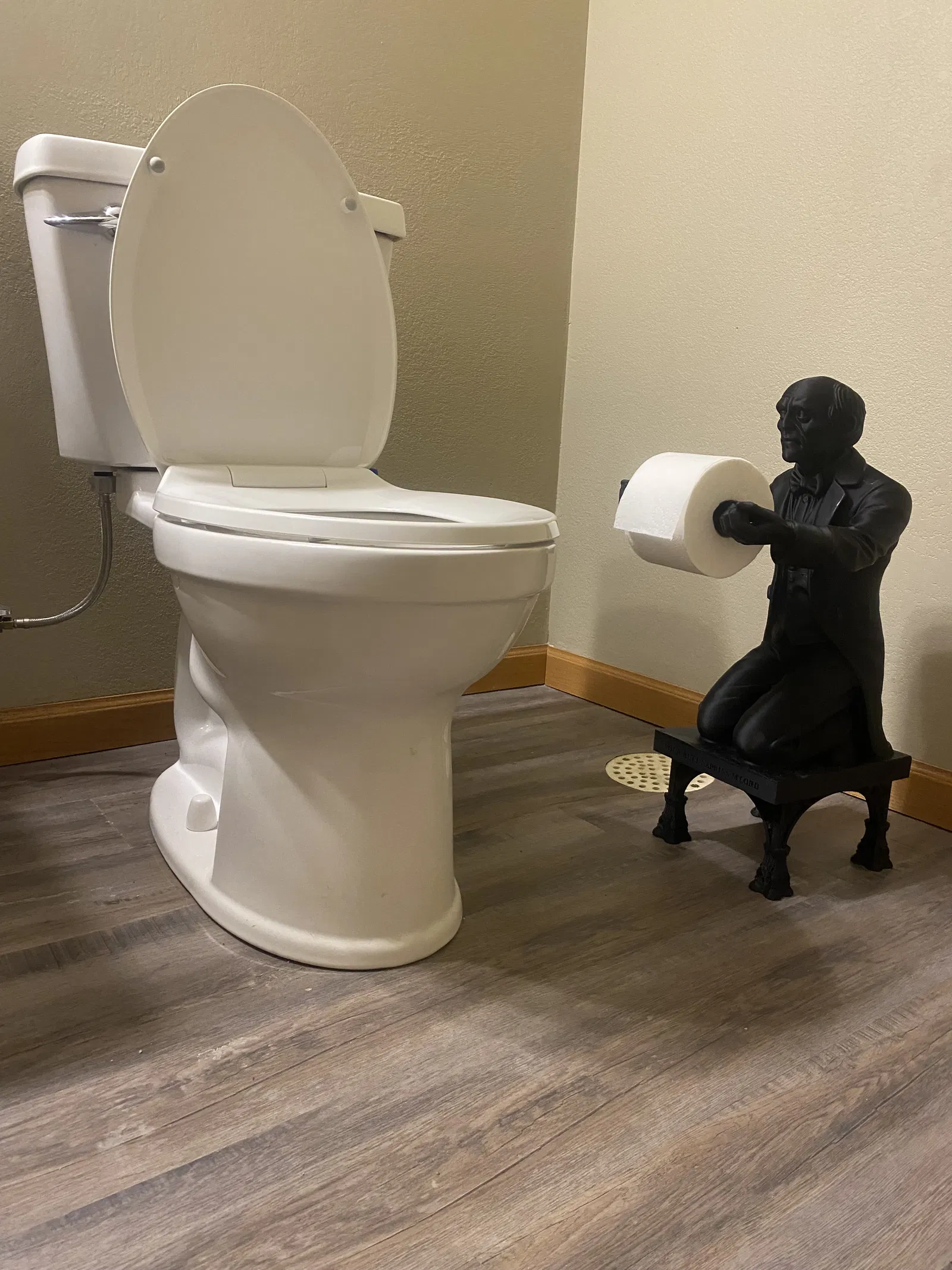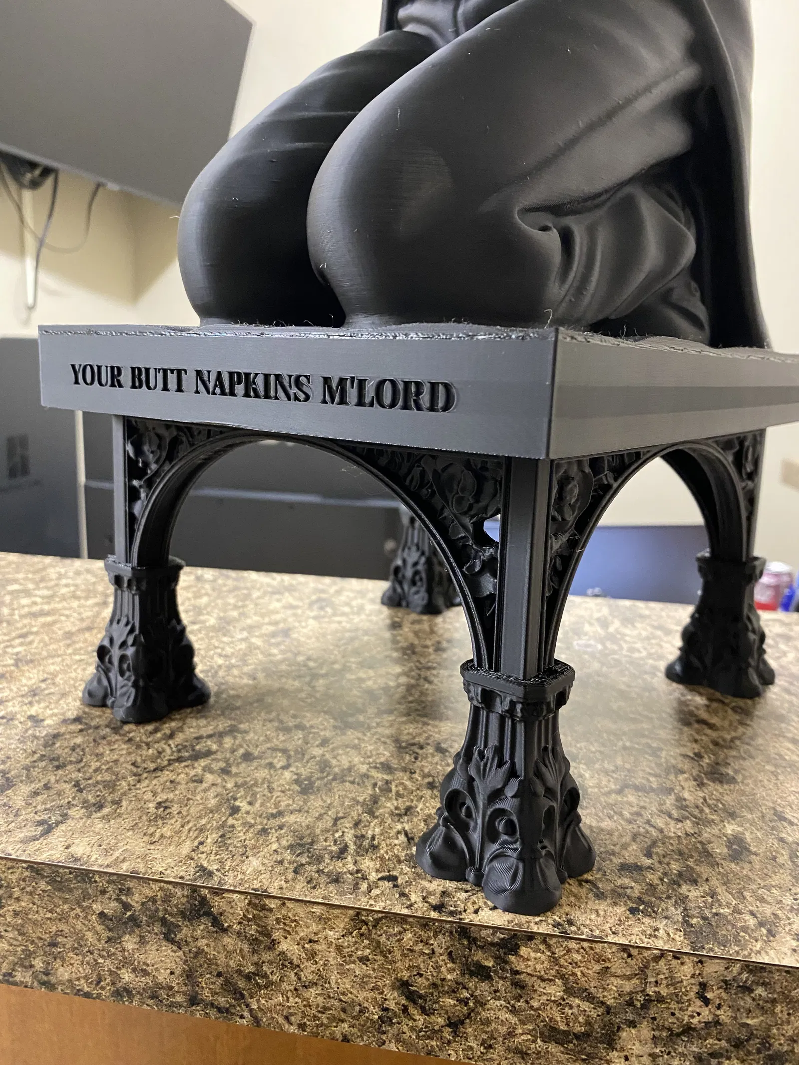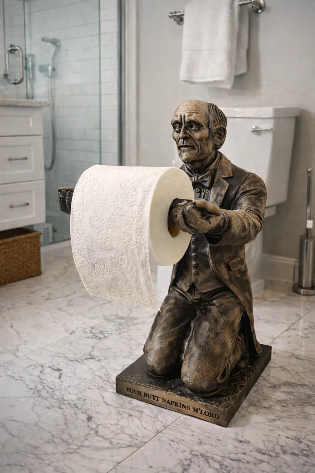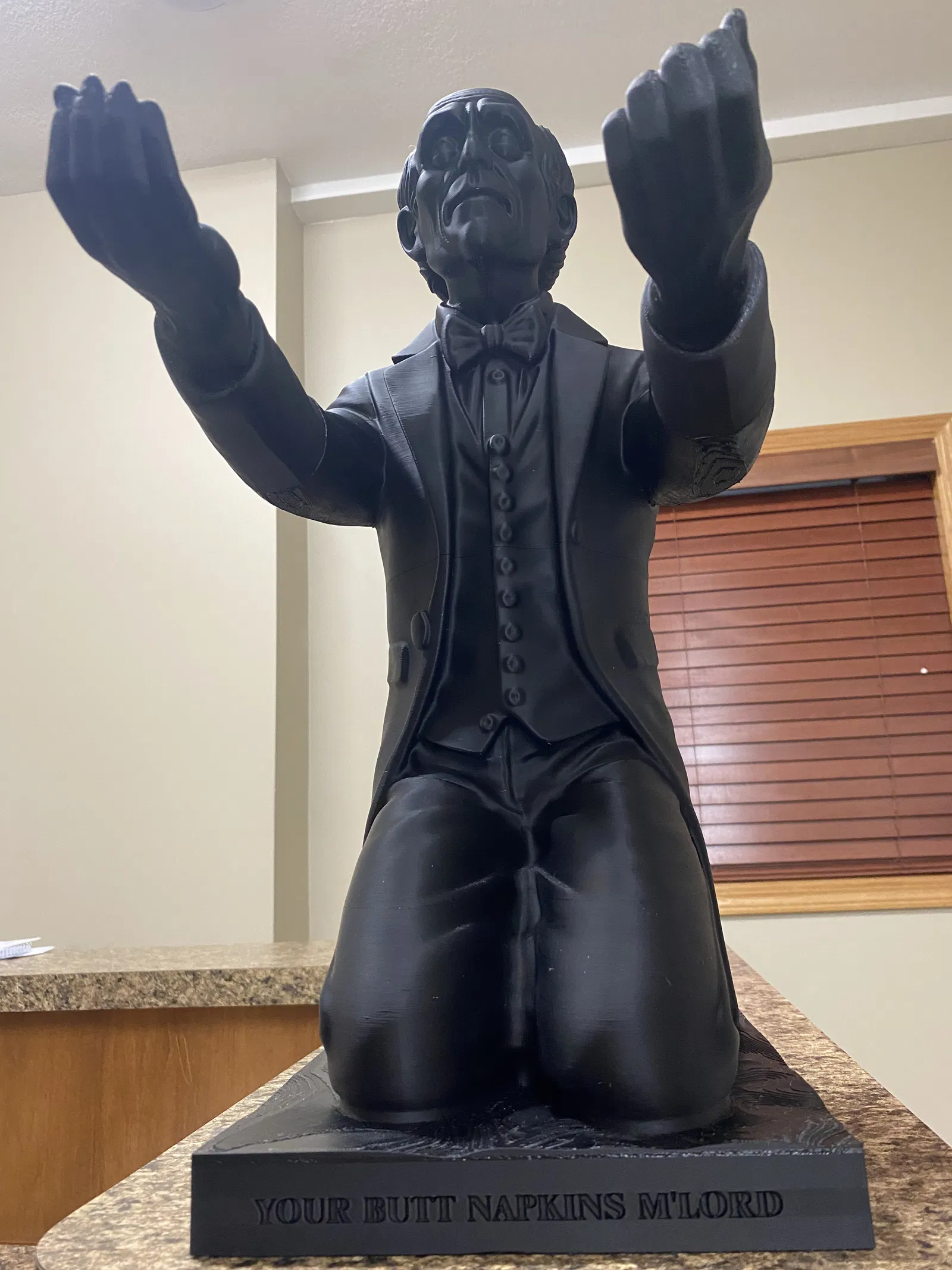 Butt-ler giữ cuộn toilet paper với câu “Your Butt Napkins M'Lord”. Model rất lớn, đã scale theo cuộn giấy chuẩn; cần supports (thân trên, tay) và in 0.2 layer height, 10% infill. Có bản pre-sliced cho Bambu A1/P1.