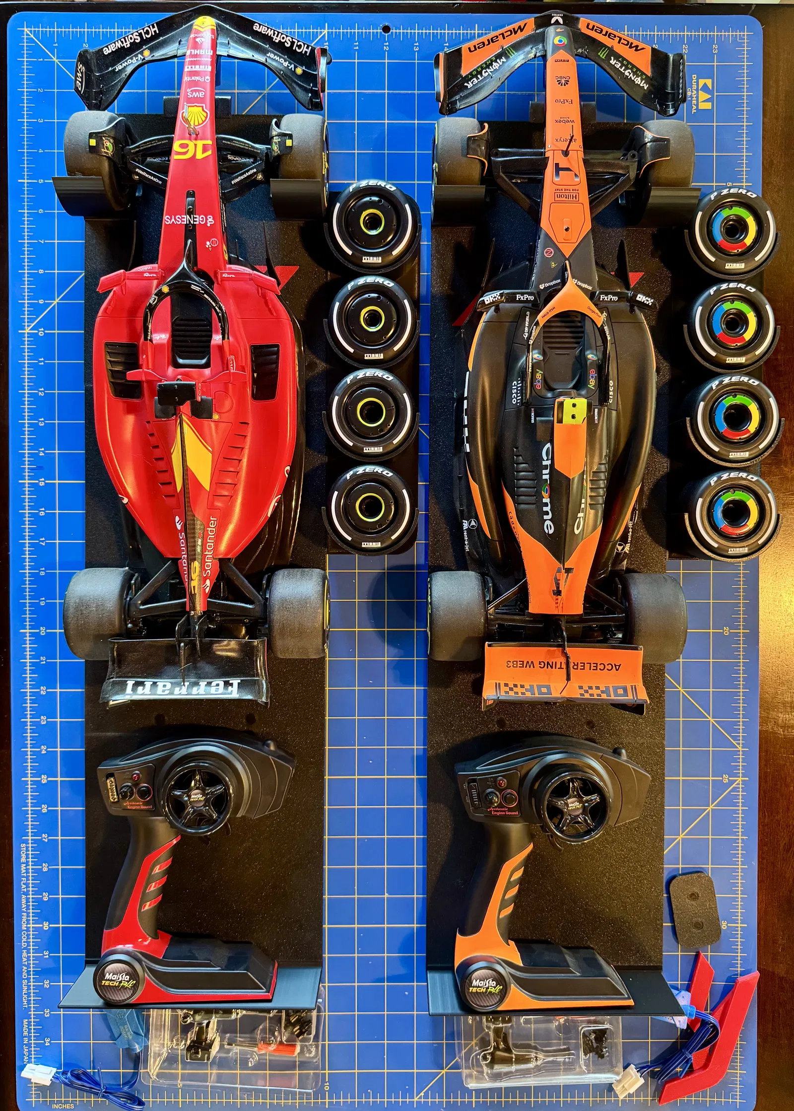 Móc treo tường & bộ organizer cho xe R/C F1 bán ở Costco. Bạn có thể in riêng tấm trên (upper plate) hoặc kết hợp bất kỳ tấm nào theo nhu cầu. Mục đích là để cất xe, tay điều khiển (transmitter) và lốp dự phòng an toàn. Tấm treo tường giúp giữ tường sạch, không bị dính bẩn từ lốp sau khi chạy.