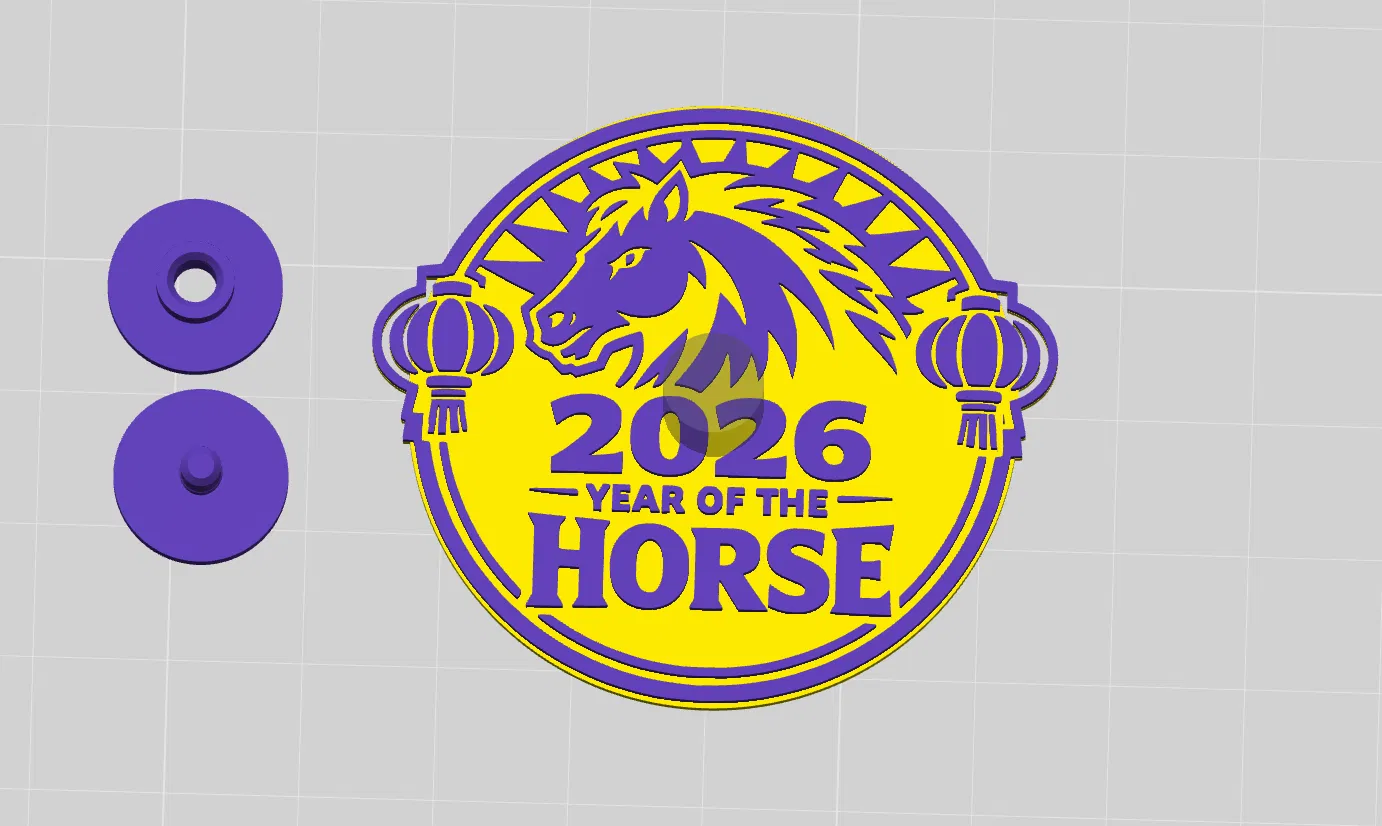 Thay vì chỉ là silhouette con ngựa, phiên bản này dùng thiết kế huy hiệu tròn, đặt profile ngựa ở giữa như một cái medallion. File được setup để in 2 màu nhanh bằng một lần đổi filament—phần emblem nổi bật trên nền tròn, nhìn gọn gàng và hoàn thiện. Không có AMS? Không sao hết. Chỉ cần pause tại lớp đổi màu rồi thay filament thủ công. Vẫn in nhanh, vẫn quay mượt.