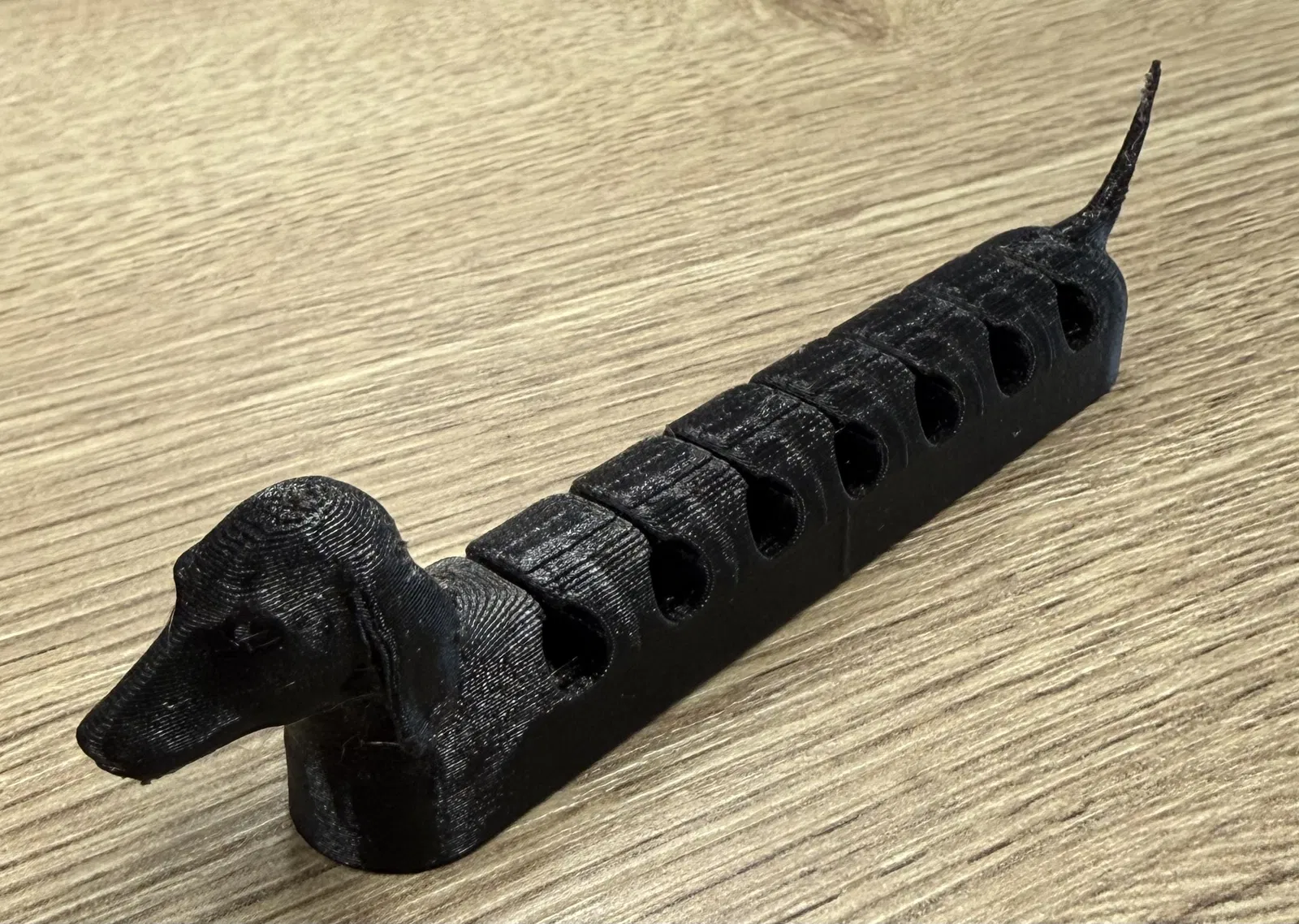 Một món sắp xếp cáp được tạo hình như chú chó Dachshund, giúp bàn làm việc của bạn gọn gàng hơn mà vẫn có chút duyên. Thân dài có thể giữ chắc nhiều sợi cáp cùng lúc, còn thiết kế dạng khe đơn giản cho phép lấy ra nhanh và thao tác dễ dàng. Mẫu này in cần supports, đặt trên mặt phẳng rất vững, đồng thời cũng kiêm luôn món trang trí vui mắt cho người mê chó.