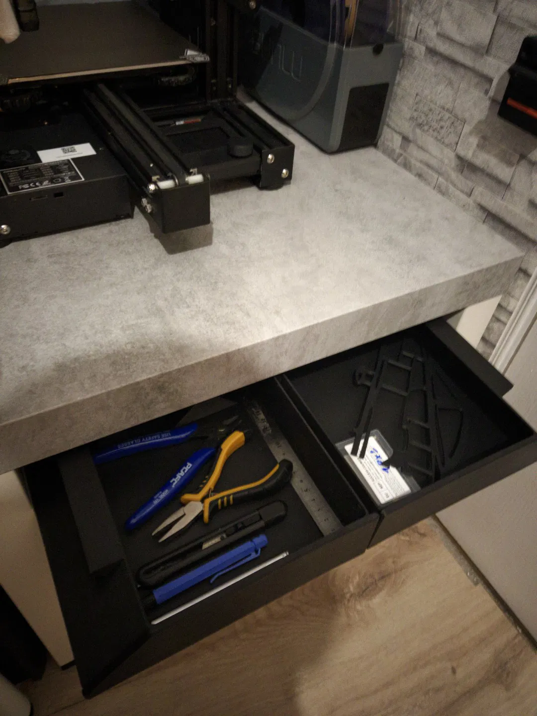 Bộ mod cho bàn Ikea Lack gồm ngăn kéo đơn giản và bracket. In 8 cái bracket, gắn 2 cái ở mỗi góc để gia cố bàn. Ngăn kéo trượt vào từ phía sau, sau đó gắn tấm ốp mặt trước.