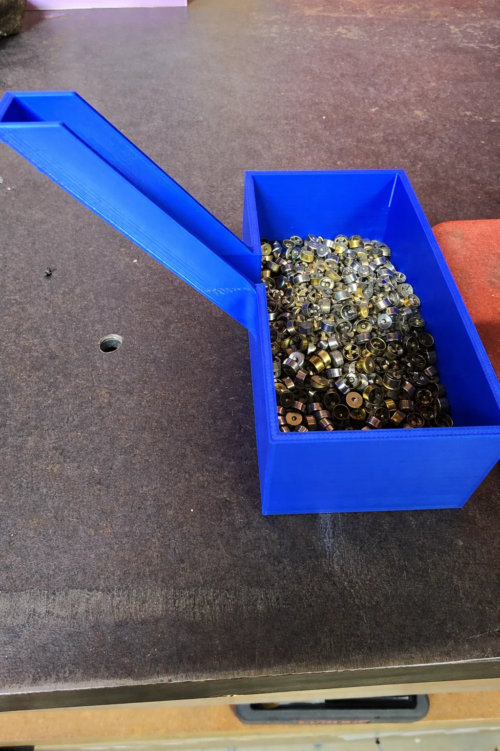 Primer catcher đơn giản cho C&H “H” style reloading press, dẫn primer đã bắn xuống máng nghiêng vào hộp hứng để không rơi ra sàn, giữ bàn sạch. In PLA/PETG, 0.2 mm, infill 10%, không cần supports.