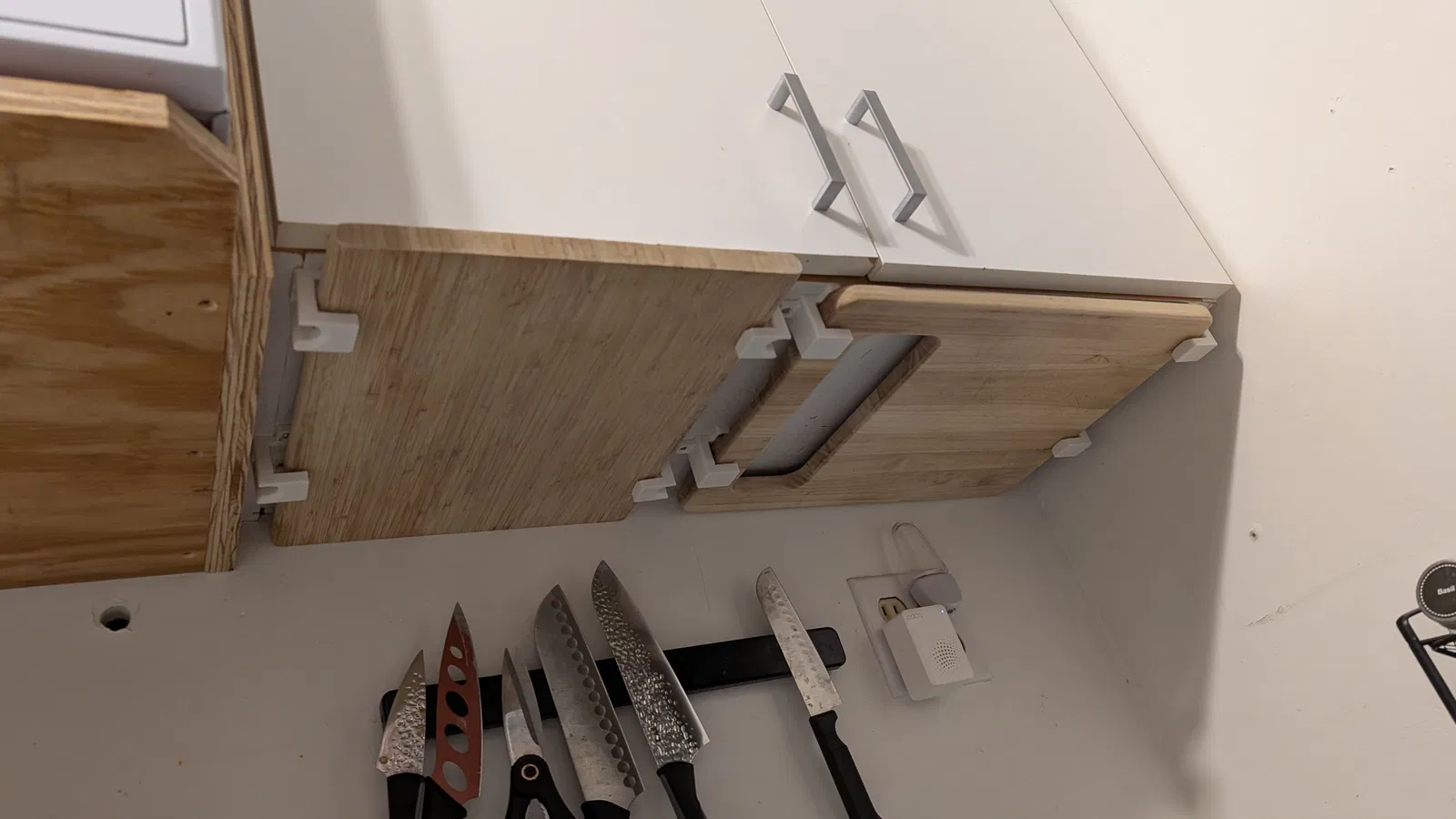 Mấy cái pát (bracket) đơn giản này giúp bạn giấu thớt dưới đáy tủ treo — tình cờ là thớt của mình vừa khít dưới tủ mà không thò ra quá nhiều gây vướng.
