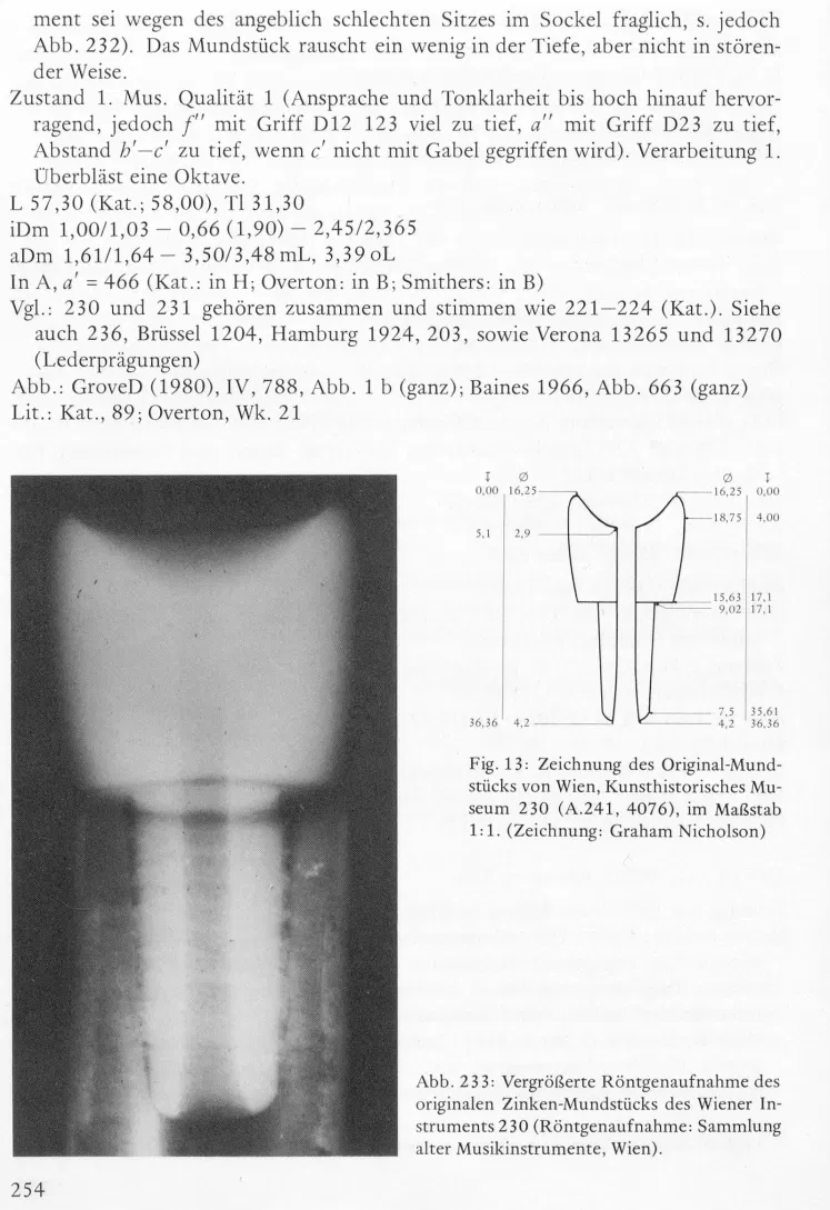 Mẫu miệng thổi cornett từ Vienna, Kunsthistorisches Museum 230 (A.241, 4076). Tài liệu kèm theo gồm bản vẽ miệng thổi nguyên bản tỷ lệ 1:1 và kích thước mouthpiece socket Ø 7,5–9,02 mm.