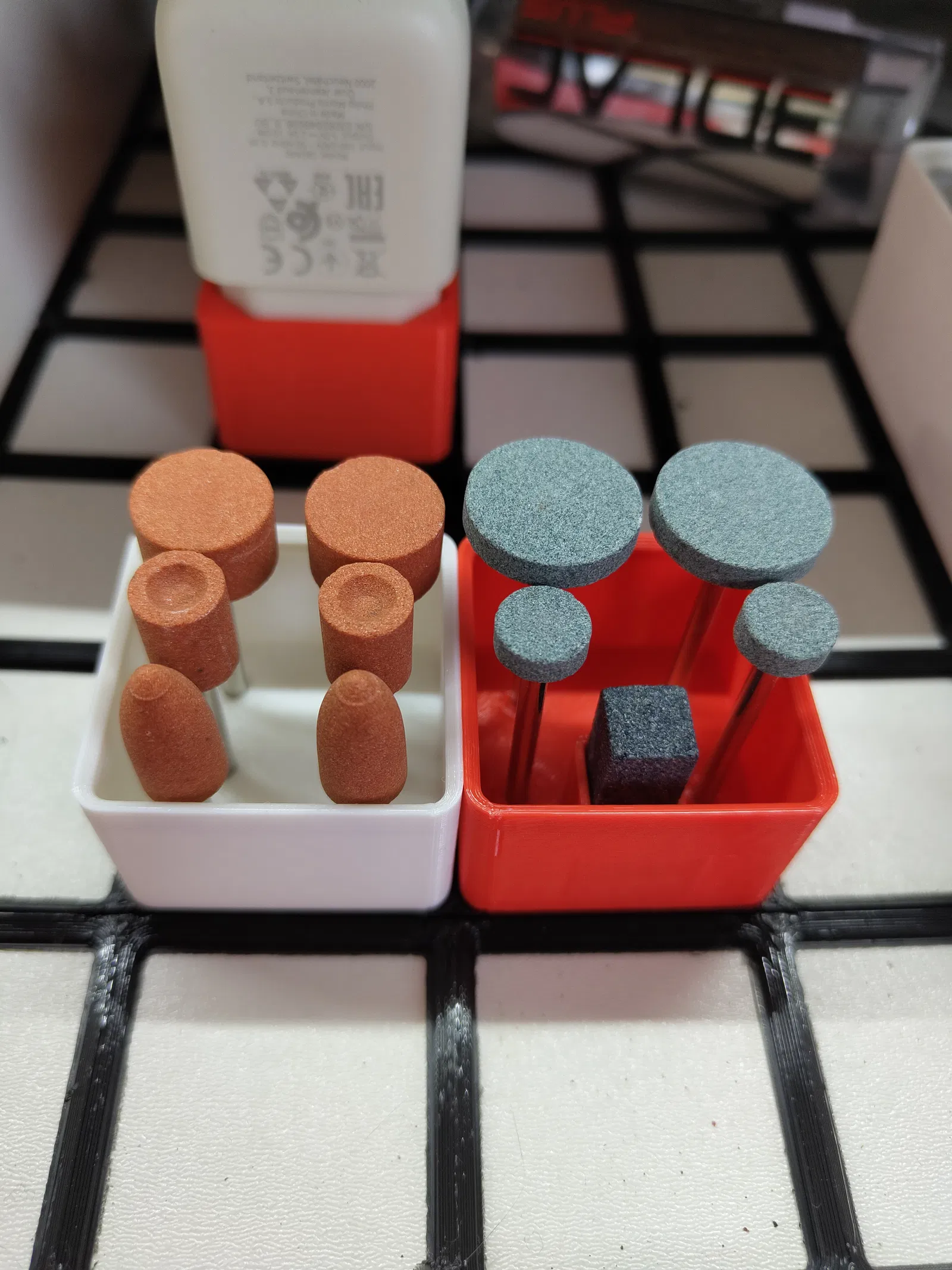 2 khay (bins) cho phụ kiện Parkside Rotary Tool của Lidl. 2 khay này hợp với các dụng cụ dùng cho kim loại và gỗ; các lỗ có đường kính 3.5mm để giữ bộ phụ kiện này.