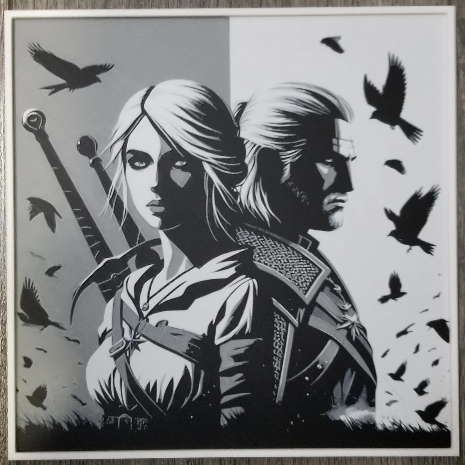 Mẫu Hueforge “The Witcher và Ciri” kích thước 200x200mm, in PLA 100% infill, layer height 0.08mm (base 0.16mm). Hướng dẫn đổi màu theo layer với 3 filament: Black, Gray, White.