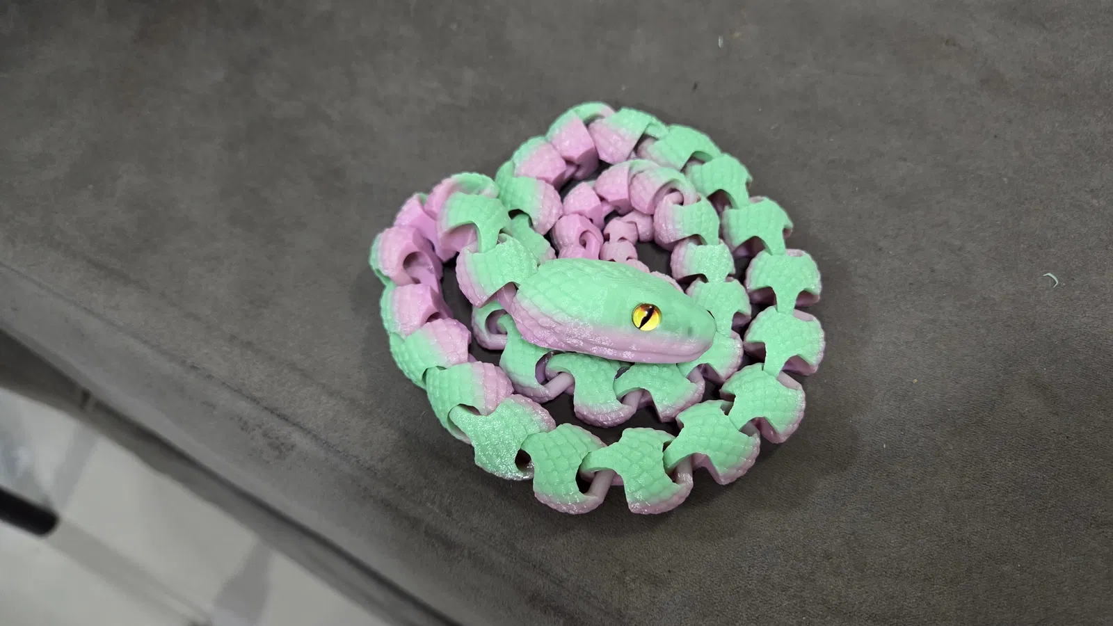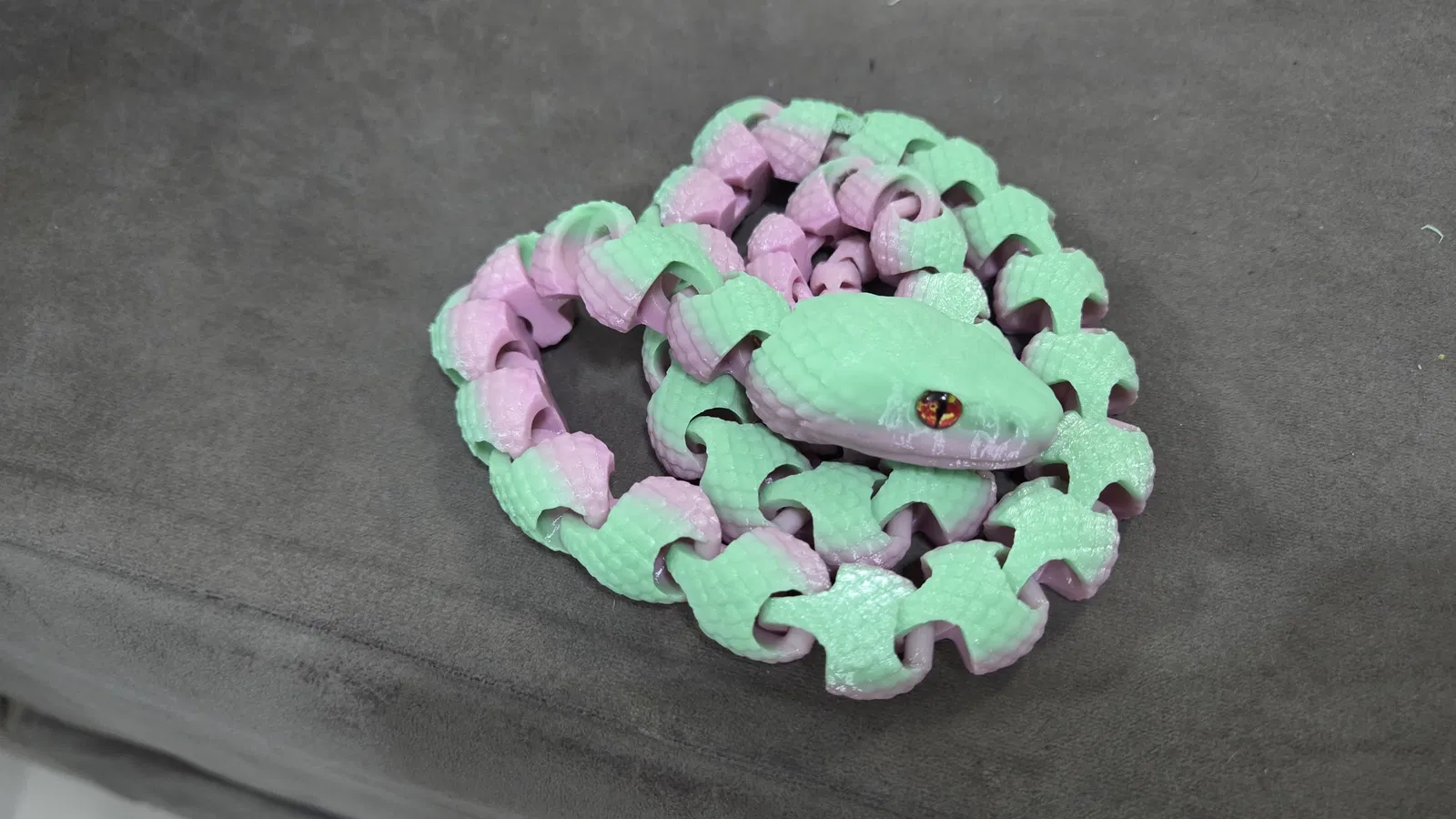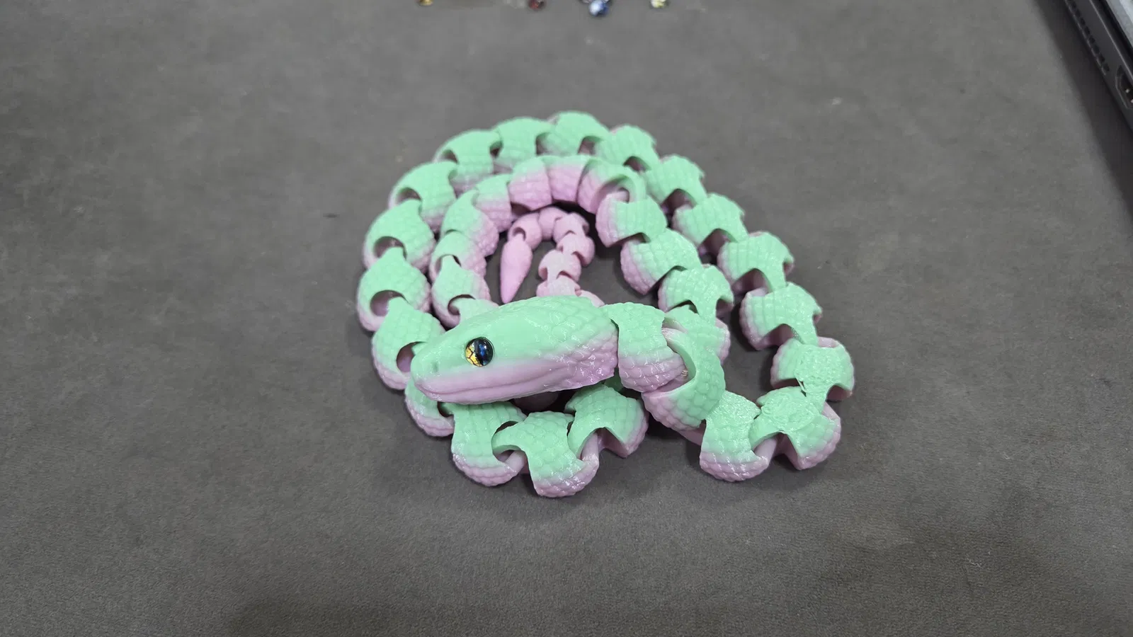 Mẫu rắn khớp nối có vảy (articulated) tương thích mắt kính 6mm và 8mm, kèm 2 file 3MF đúng kích thước. Không nên scale vì sẽ đổi size lỗ mắt. In không cần support/brim nhưng cần bám bàn in tốt.